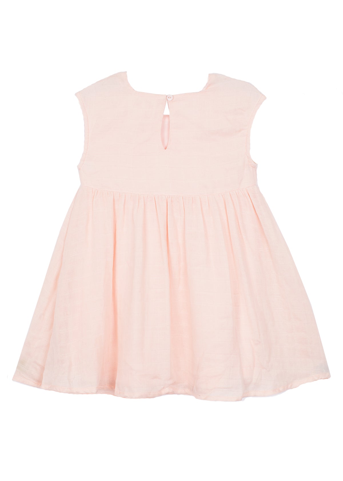 This charming girl's dress in a soft blush pink hue is crafted from a breathable fabric for all-day comfort. It features delicate embroidered daisies on the bodice, adding a whimsical touch. The dress is designed with a flowy silhouette and a back button closure for easy dressing, making it perfect for any occasion.