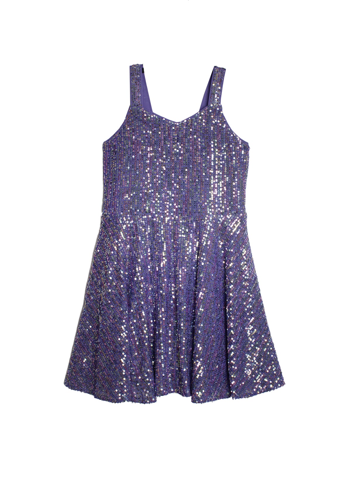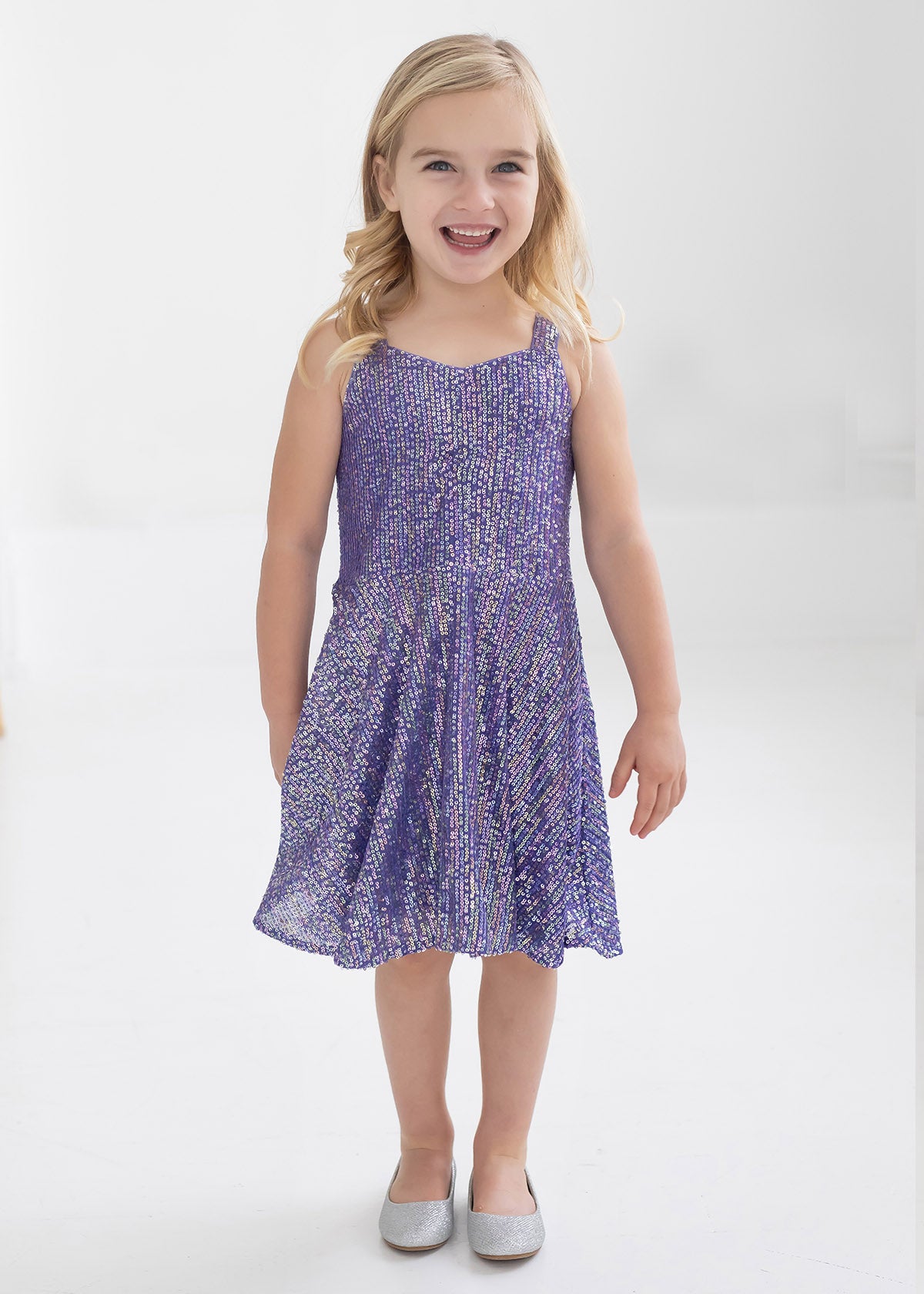 The Dancing Queen Dress sparkles in a majestic purple sequined fabric that captures the light with every move. This sleeveless dress features a flattering A-line silhouette and a playful flared skirt, making it perfect for dancing the night away. It?s the ultimate choice for parties or special events.