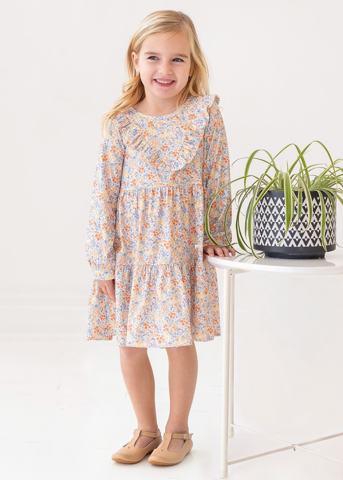 Introduce a burst of spring to her wardrobe with the Darling Orchard Dress. This lovely piece features a delicate floral print in shades of blue and orange on lightweight soft fabric. The dress is accented with a ruffled collar and a full, tiered skirt, perfect for twirling and play. Ideal for both special occasions and everyday wear.