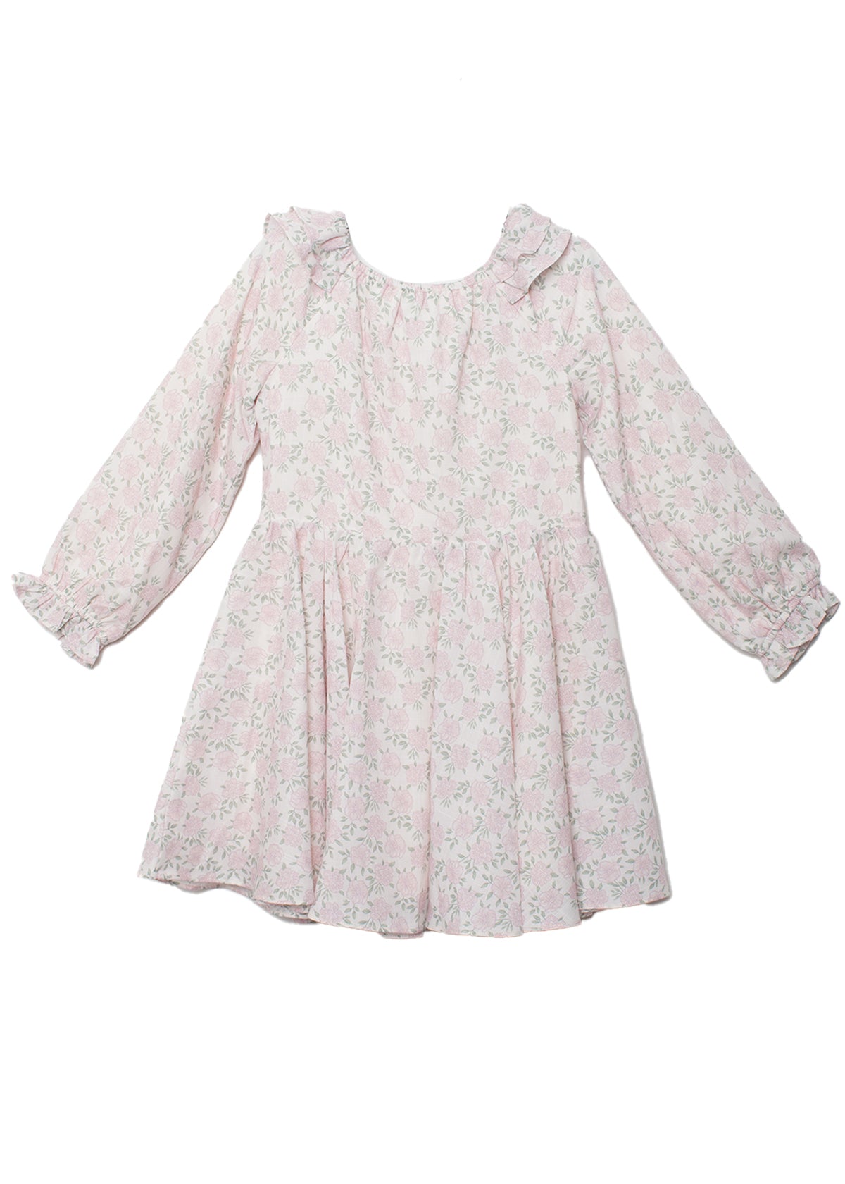 The Dewy Rose dress combines elegance with playful flair. Crafted from lightweight fabric, it features long sleeves with gathered cuffs, a ruffled collar with bow detail, and a gathered waist that flows into a flared skirt. Adorned with delicate pink blossoms and green accents on a soft blush background, this dress is perfect for any special outing or celebration.