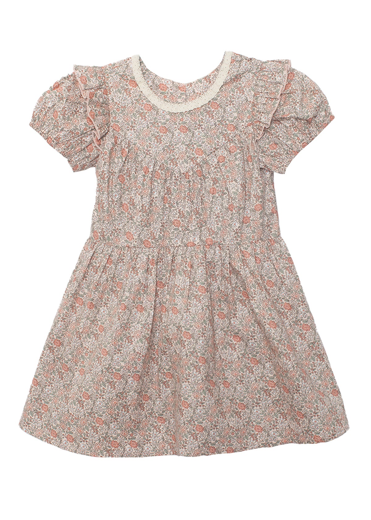 The Emmaline Dress is a picture of timeless charm, designed with thoughtful details to delight. Its soft, breathable fabric features a delicate all-over pink floral pattern, adding a touch of vintage-inspired elegance. With playful ruffled short sleeves, a rounded neckline trimmed with lace, and a gently gathered bodice that flows into a flared skirt, this dress combines comfort and style for a look that?s both effortless and unforgettable.