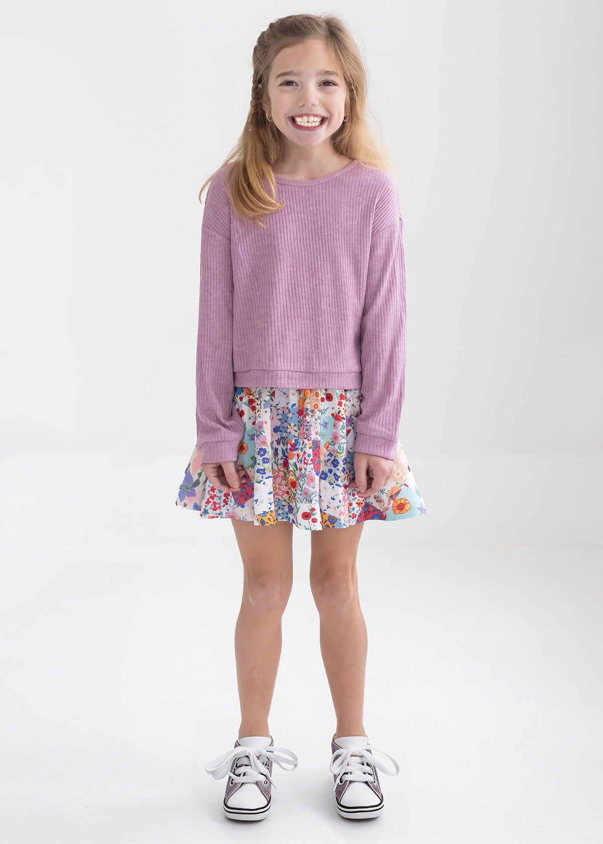 This girl's two piece set features a soft, long-sleeve top in a delicate mauve shade paired with a vibrant, floral skirt. The top has a relaxed fit, perfect for layering or wearing on its own. The skirt adds a splash of color with its lively floral pattern and flared silhouette, creating a fun and stylish outfit for any occasion.
