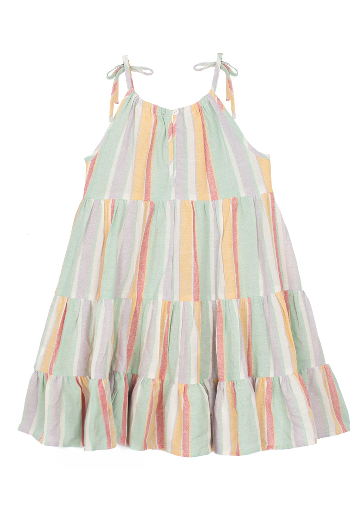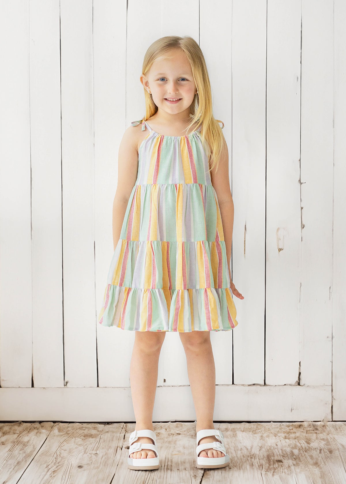 This girls' dress features a playful multicolor stripe pattern in soft pastel hues of green, yellow, pink, and white. Designed with adjustable tie straps and a tiered silhouette, it offers a breezy and comfortable fit. The lightweight fabric ensures easy movement, making it a perfect choice for warm-weather adventures and special outings.