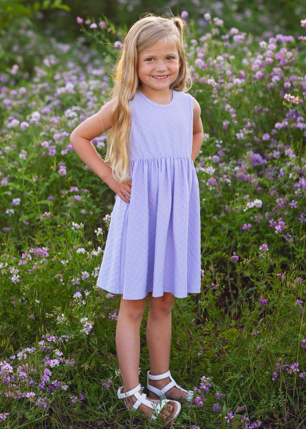 Lovely sleeveless dress for girls in lavender terry cloth with checkered patterns. The dress features a natural wasit fit with amazing bow cutout details on the back.