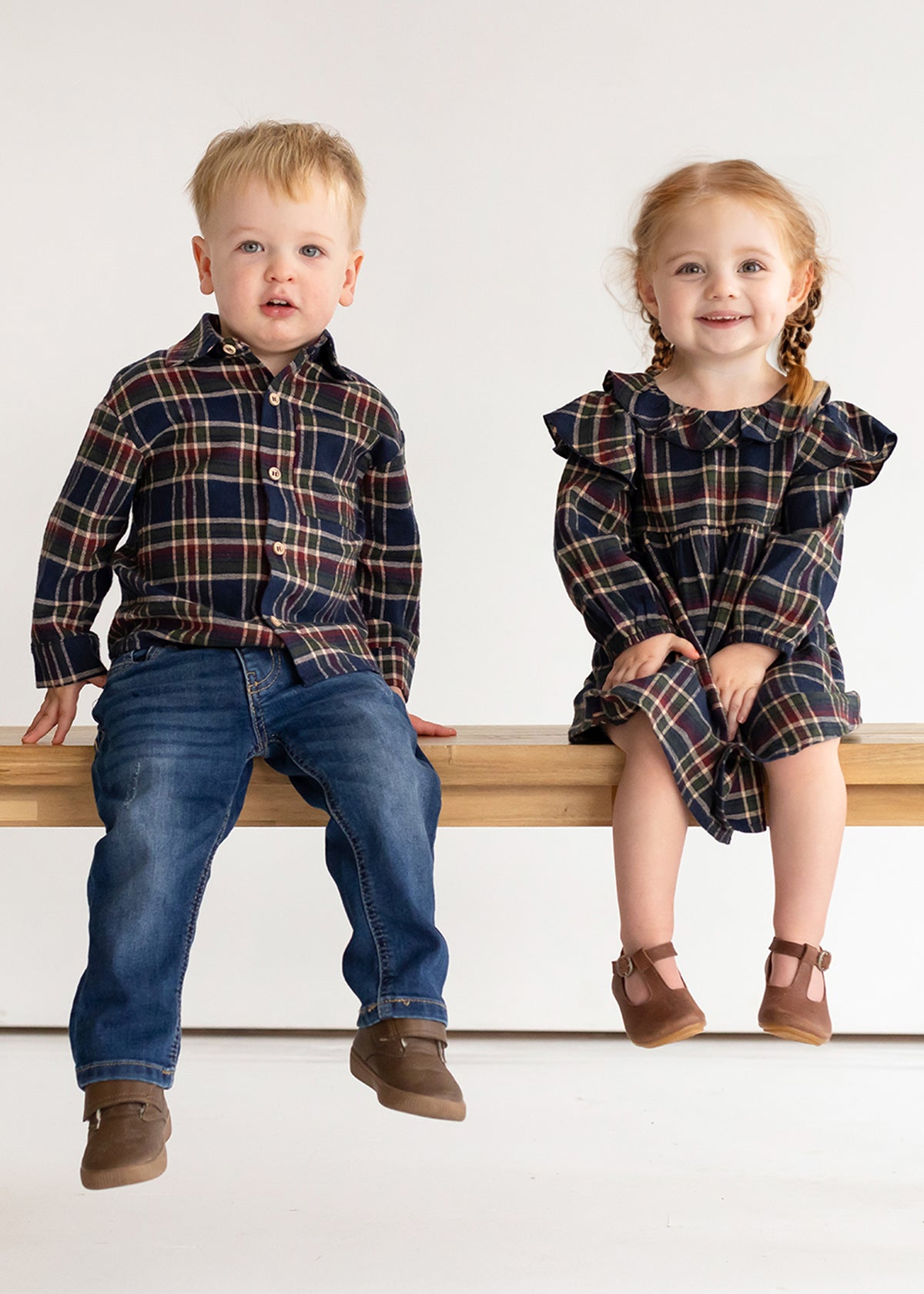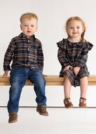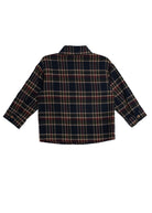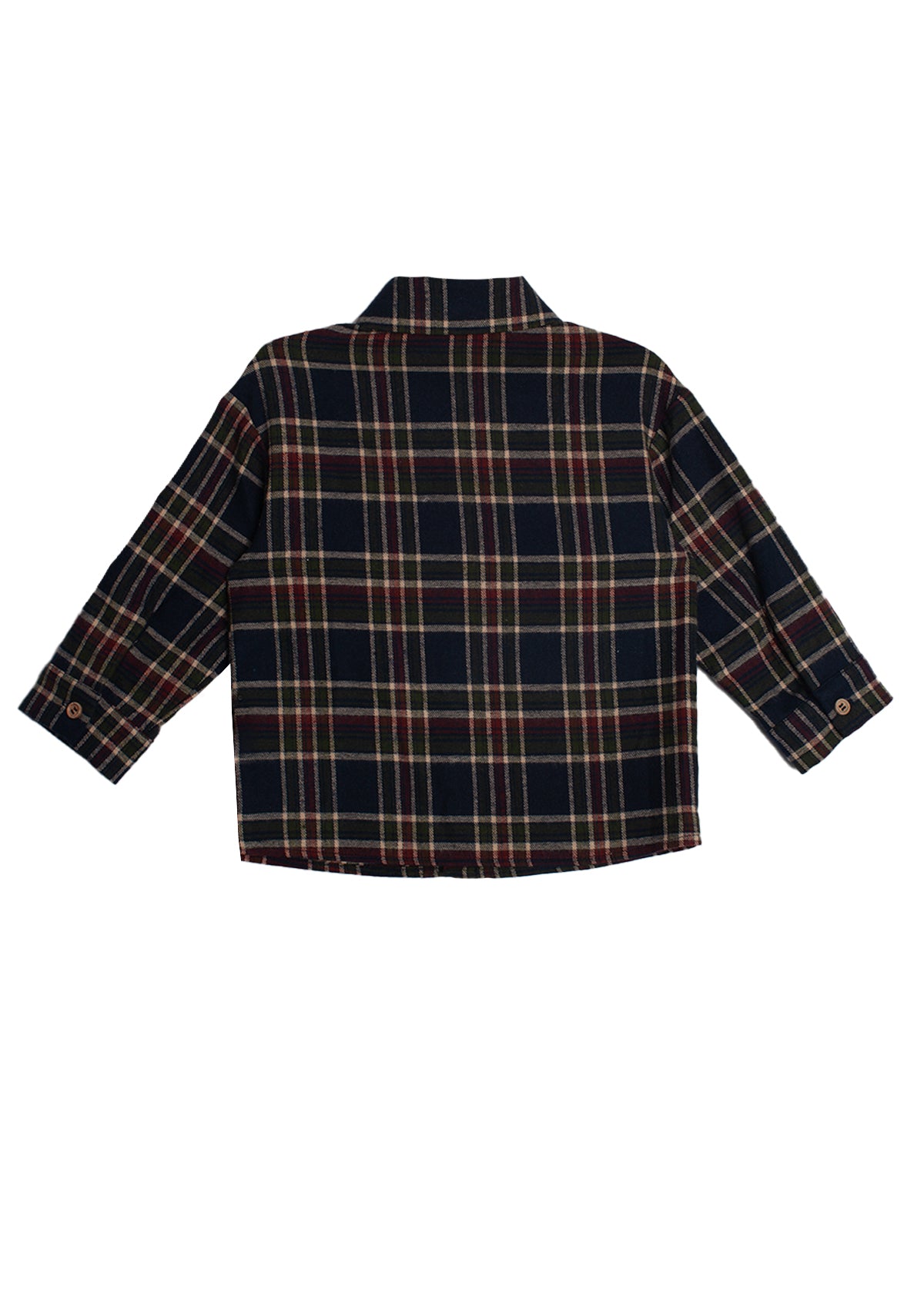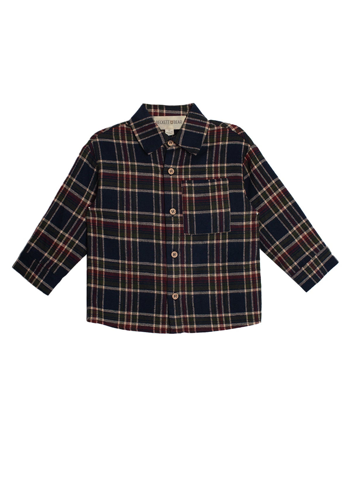 This classic boys' top features a rich plaid pattern in navy, burgundy, and cream tones, perfect for fall and winter layering. The design includes a traditional collar, long sleeves, and a front button-down closure. A single chest pocket adds a practical touch, making it ideal for both casual and semi-formal occasions.
