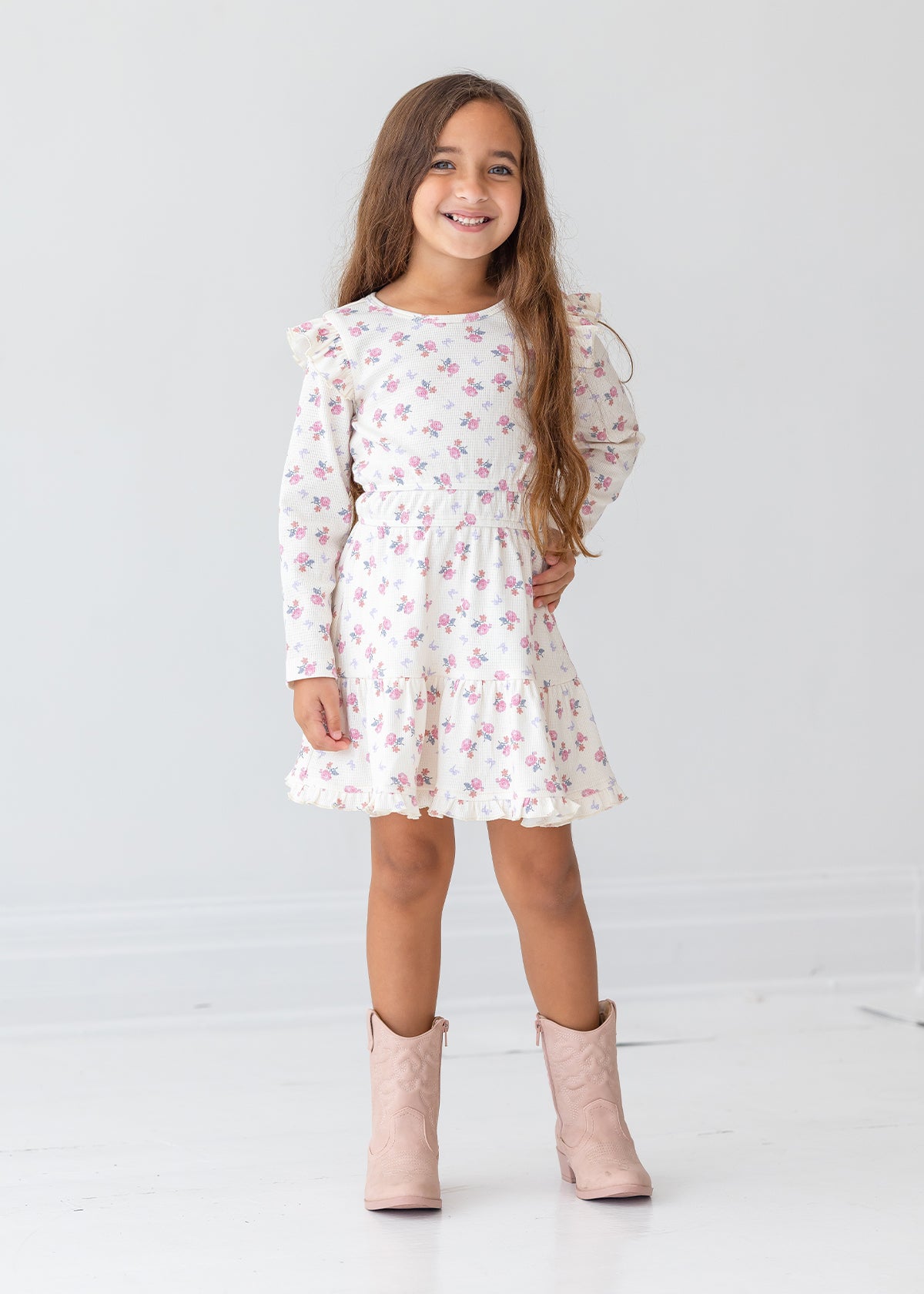 The Mia Dress features a playful touch with its soft ivory backdrop adorned with a delicate floral pattern. Thoughtfully designed with ruffled shoulders and a tiered hem, it brings an extra touch of cuteness to your little one's wardrobe. The elastic waist creates a flattering, comfortable fit, while its long sleeves make it perfect for cozy, everyday elegance.