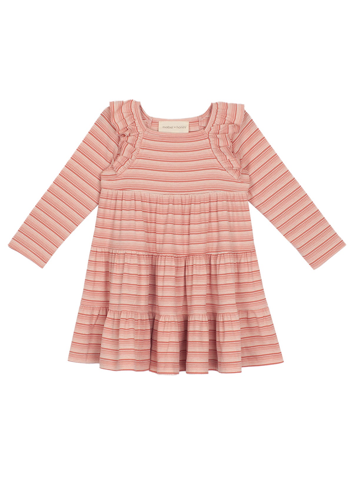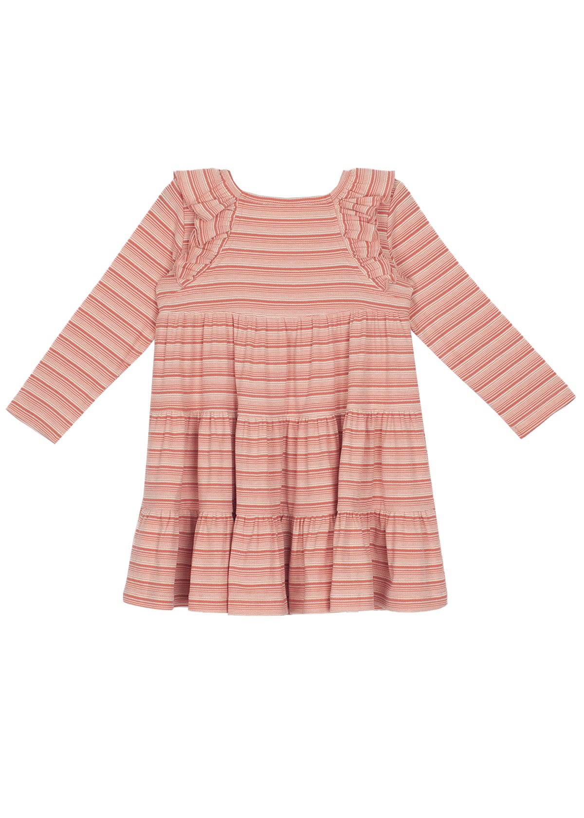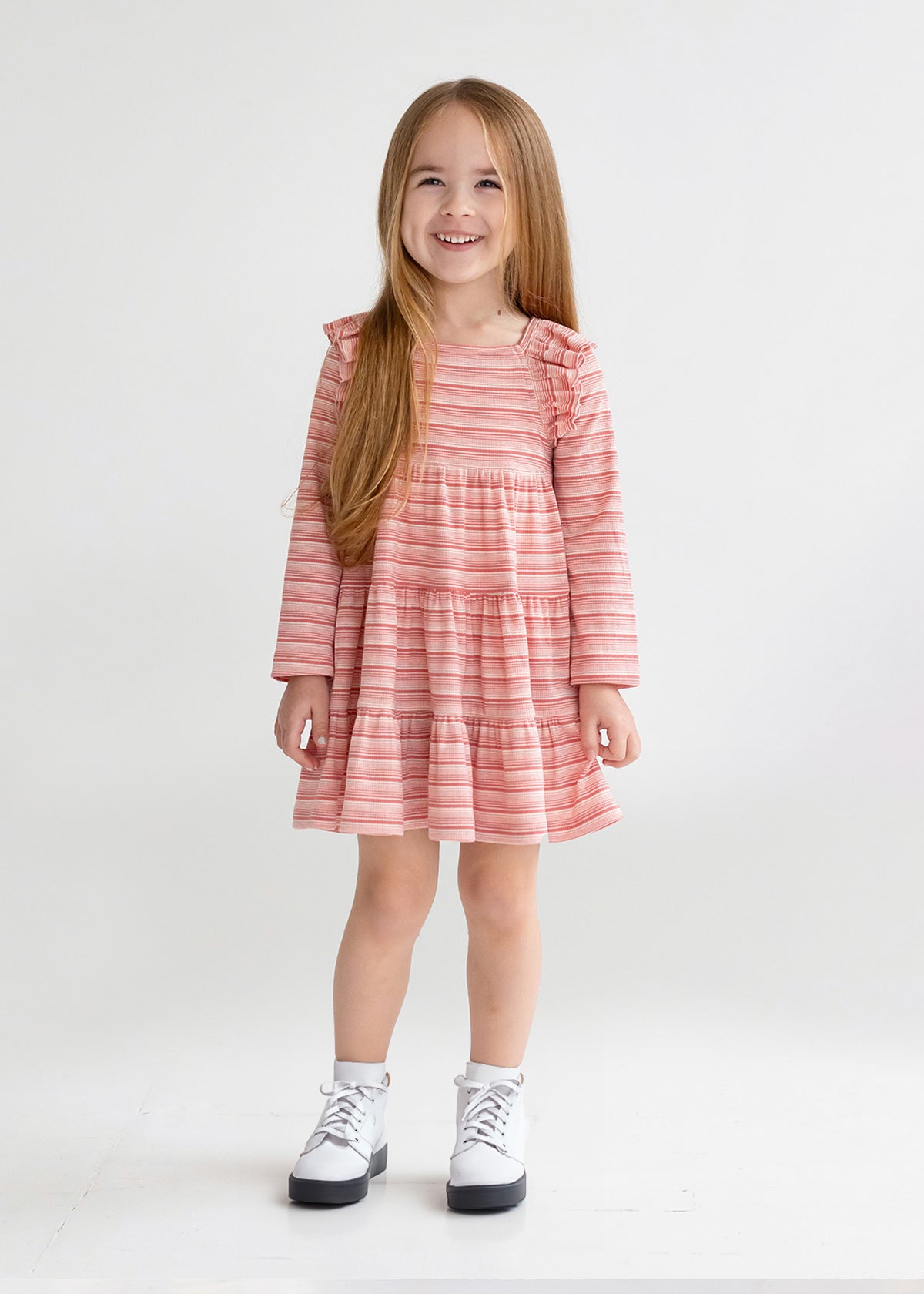 This charming girl's dress features a soft and stretchy fabric with a delicate striped pattern in warm pink tones. The dress is designed with long sleeves and subtle ruffle details on the shoulders, adding a playful touch. The tiered skirt creates a lovely flow, perfect for twirling and everyday adventures. Ideal for both casual and special occasions.