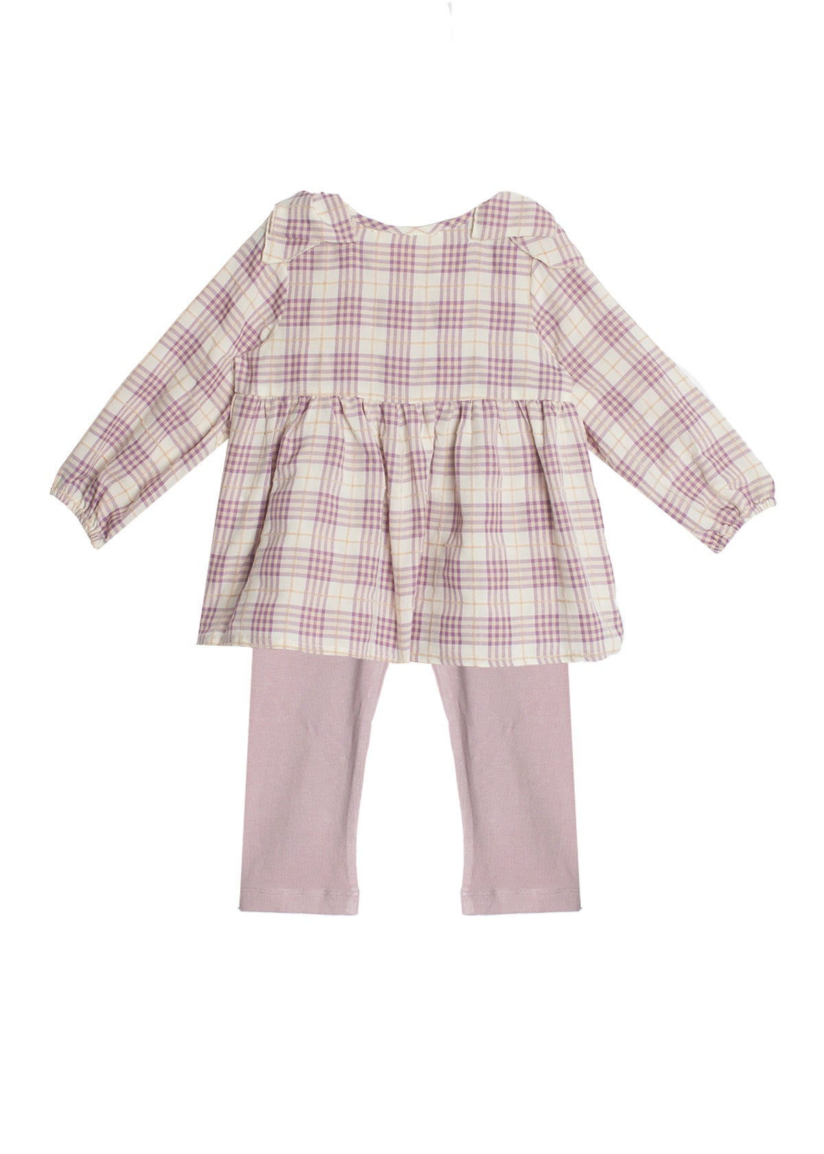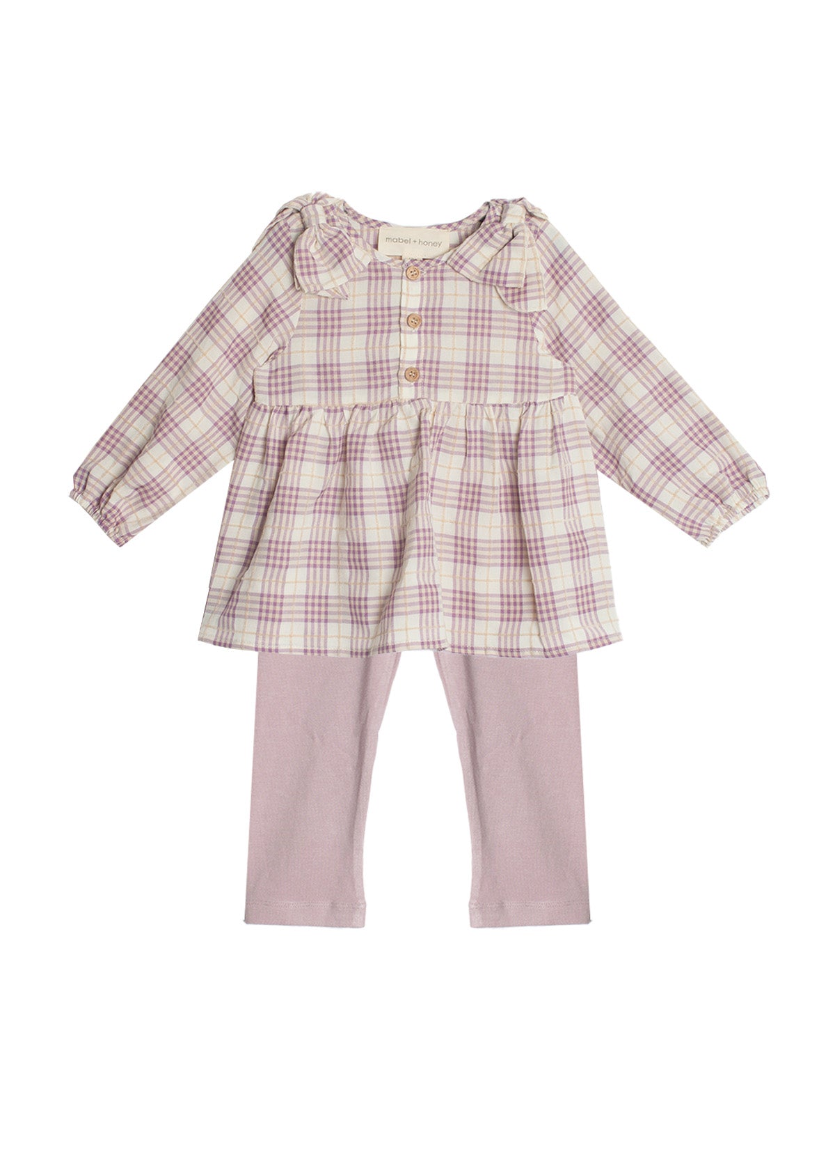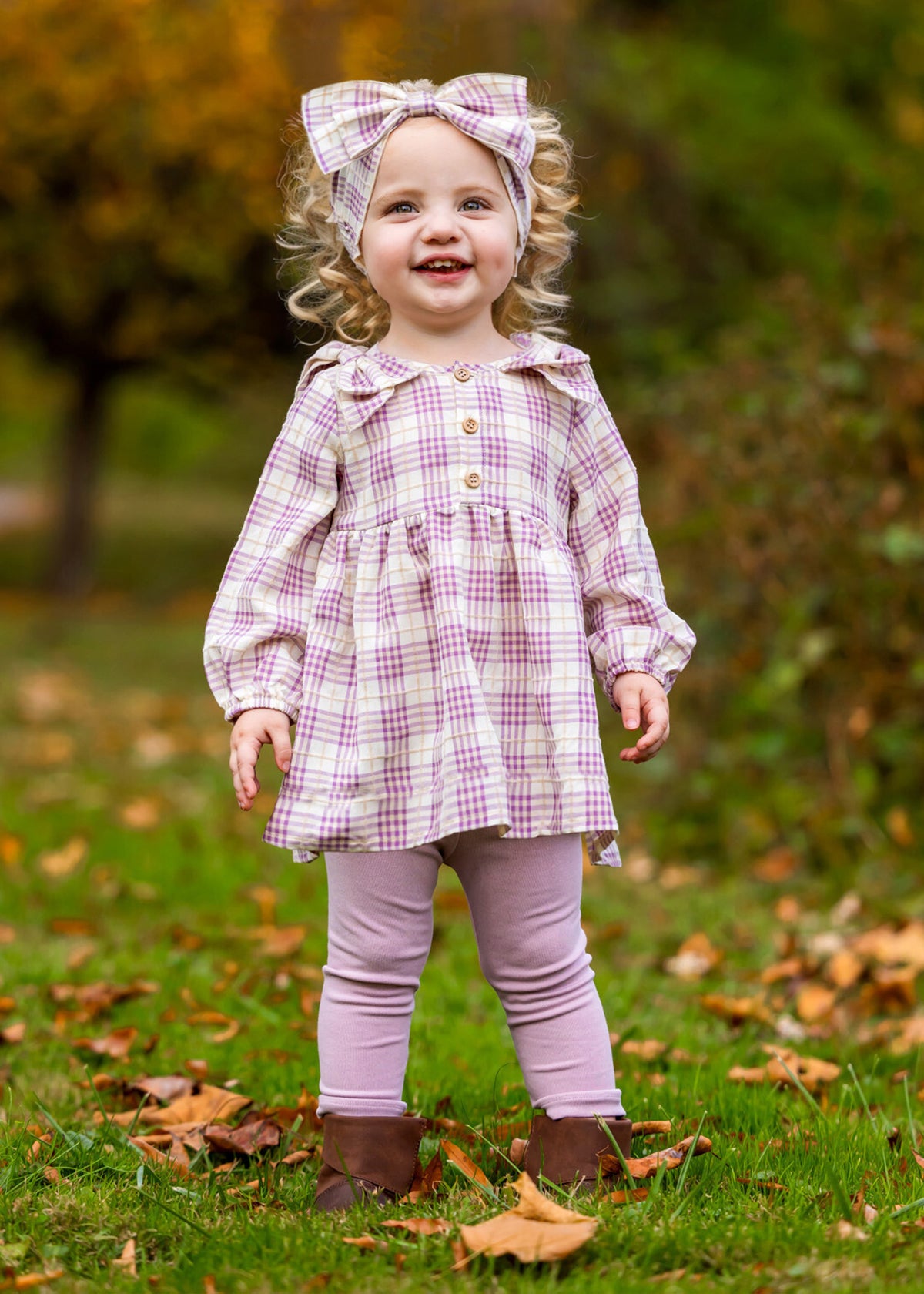 This adorable two-piece set for girls features a cozy, long-sleeve top in a charming lavender and cream plaid pattern, complete with a delicate ruffle trim around the collar and functional front buttons. Paired with soft lavender leggings, this outfit is perfect for comfortable play and casual outings, offering a sweet, coordinated look