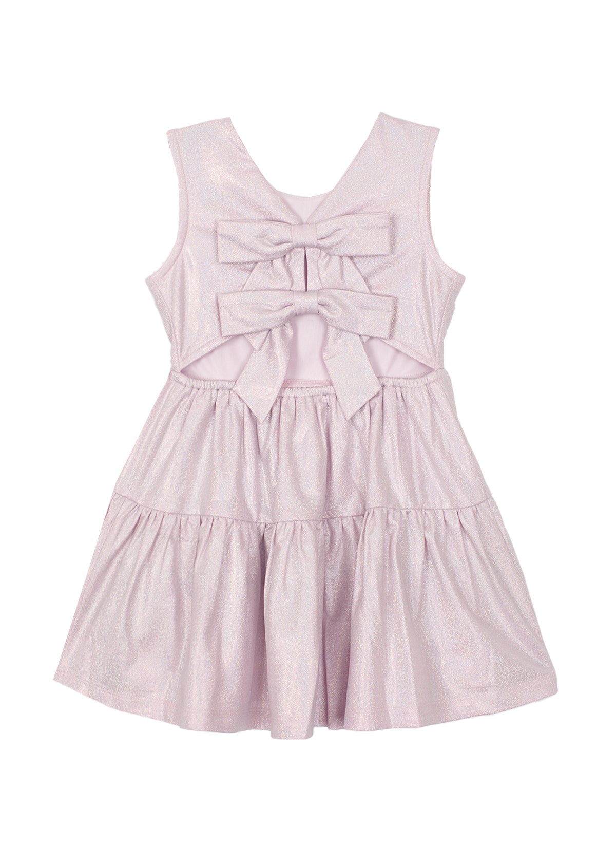 This girls' dress in a soft lavender hue features a shimmering metallic fabric for a radiant touch. Designed with a sleeveless bodice and a tiered skirt, it offers a breezy, twirl-worthy silhouette. The lightweight feel and comfortable fit make it perfect for adding a hint of sparkle to any day.