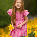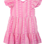 This vibrant pink dress features delicate white embroidery. Designed with flutter sleeves, a tiered skirt, and a criss-cross back detail, it offers a playful yet elegant look. The lightweight fabric ensures comfort, while the gathered waist and ruffled hem add volume and movement, making it perfect for warm-weather outings.