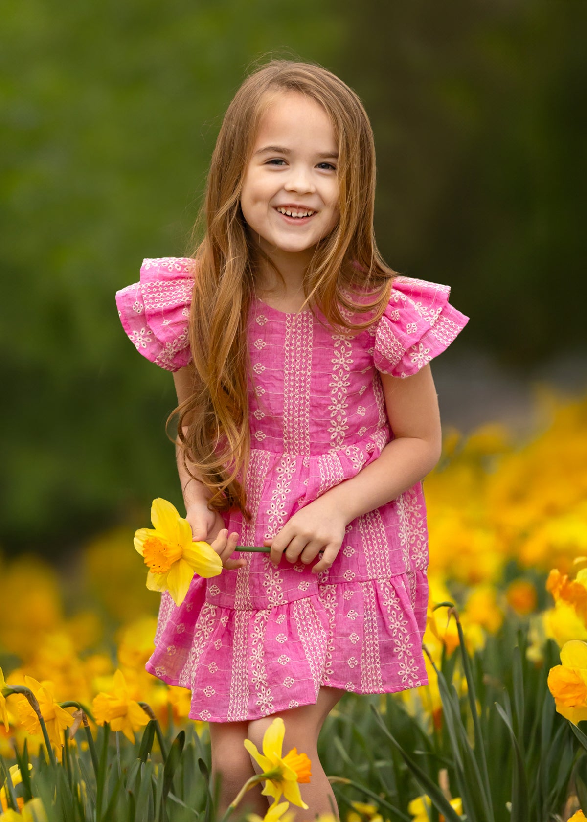 A young girl smiles while holding a yellow daffodil in a blooming field, wearing the Pinkalicious Short Sleeve Dress by Mabel and Honey.