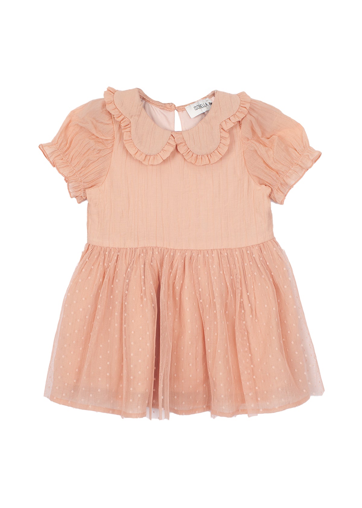 This girls' dress in a soft peach hue features a lightweight fabric with a delicate dotted tulle overlay on the skirt. A ruffled Peter Pan collar and puff sleeves add a vintage-inspired touch, while the gathered waist creates a flowy silhouette. A back button closure ensures easy dressing with timeless style.
