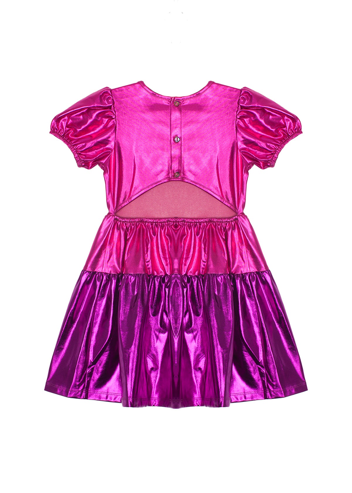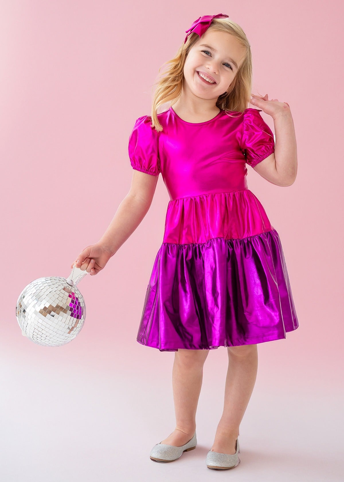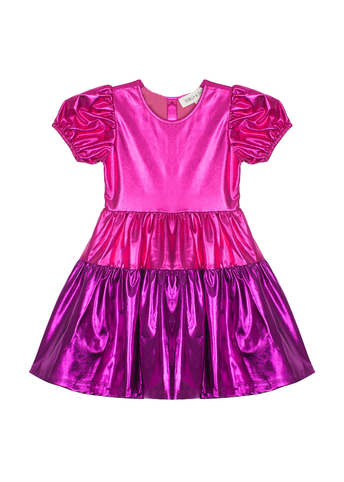 This eye-catching girls' dress dazzles with a metallic sheen in bold shades of fuchsia and deep violet. The dress features puffed short sleeves and a tiered skirt that adds playful volume. The smooth, shiny fabric gives it a glamorous feel, making it perfect for special events or festive occasions.