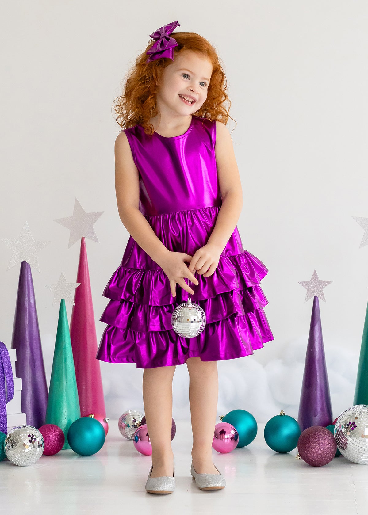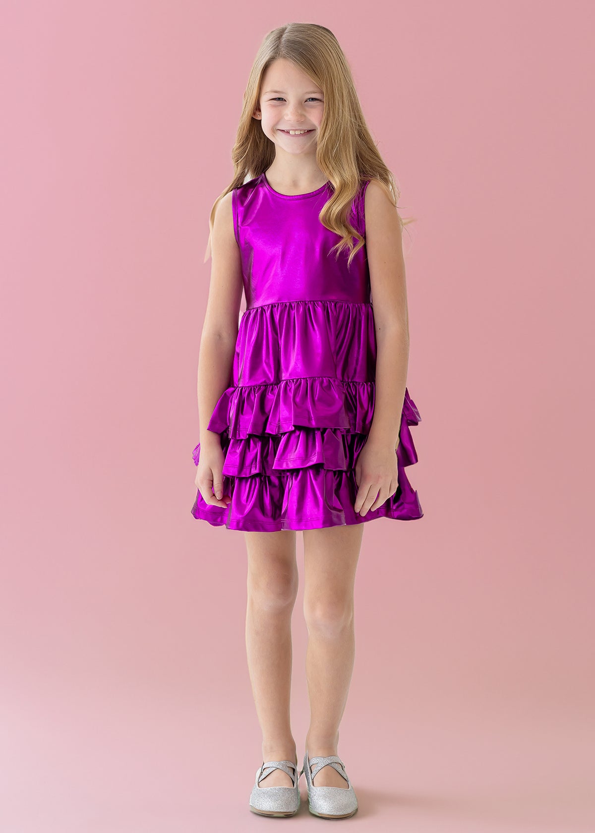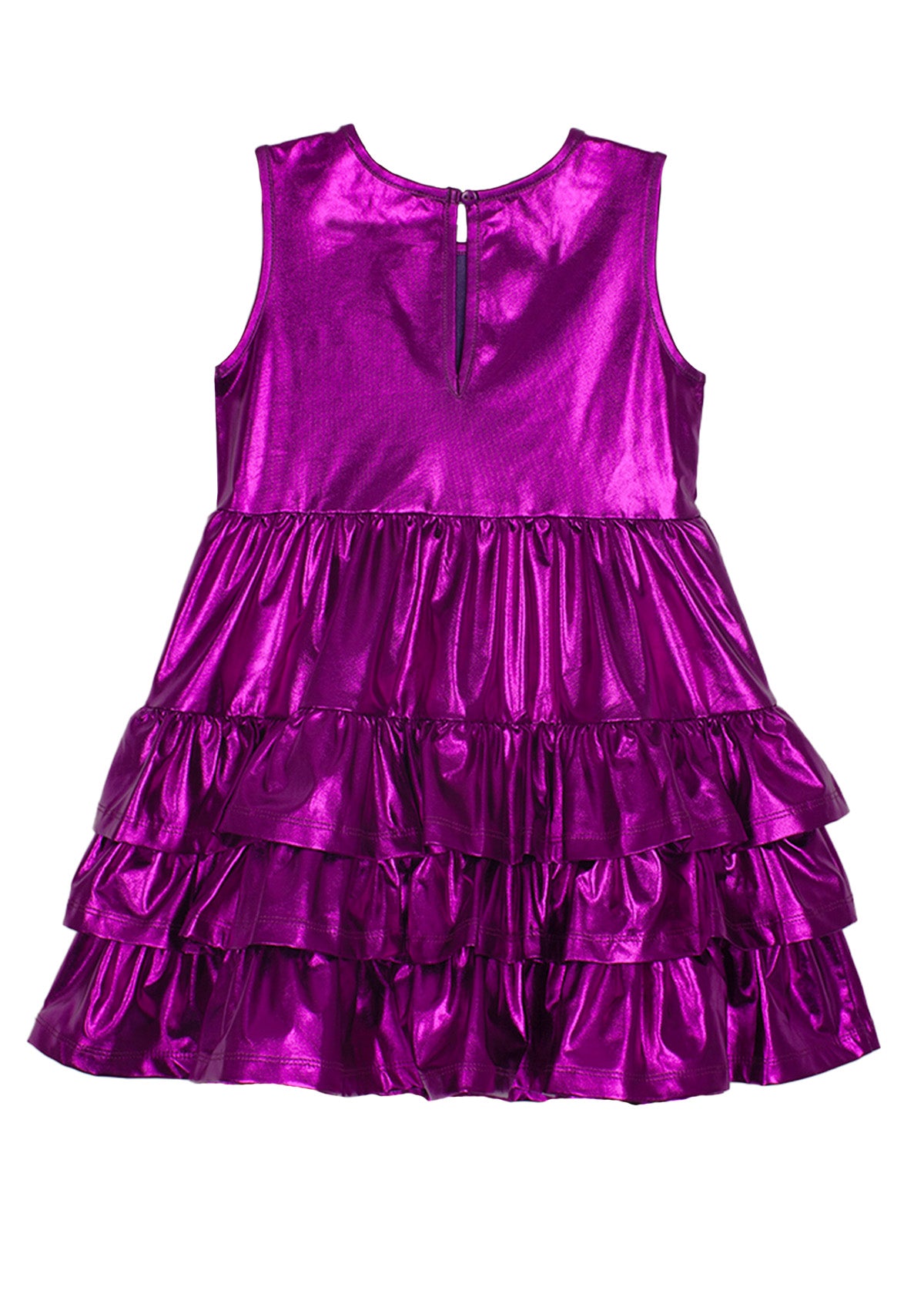 This stunning girl's dress features a vibrant, metallic purple fabric that catches the light beautifully. The sleeveless design is perfect for warmer days, while the triple-tiered ruffle skirt adds volume and movement for a twirl-worthy look. The dress fastens at the back with a button, ensuring a comfortable fit for your little one. Ideal for special occasions.