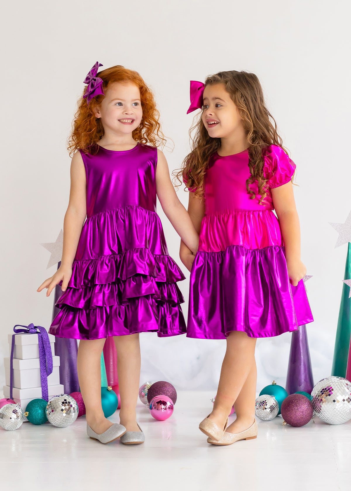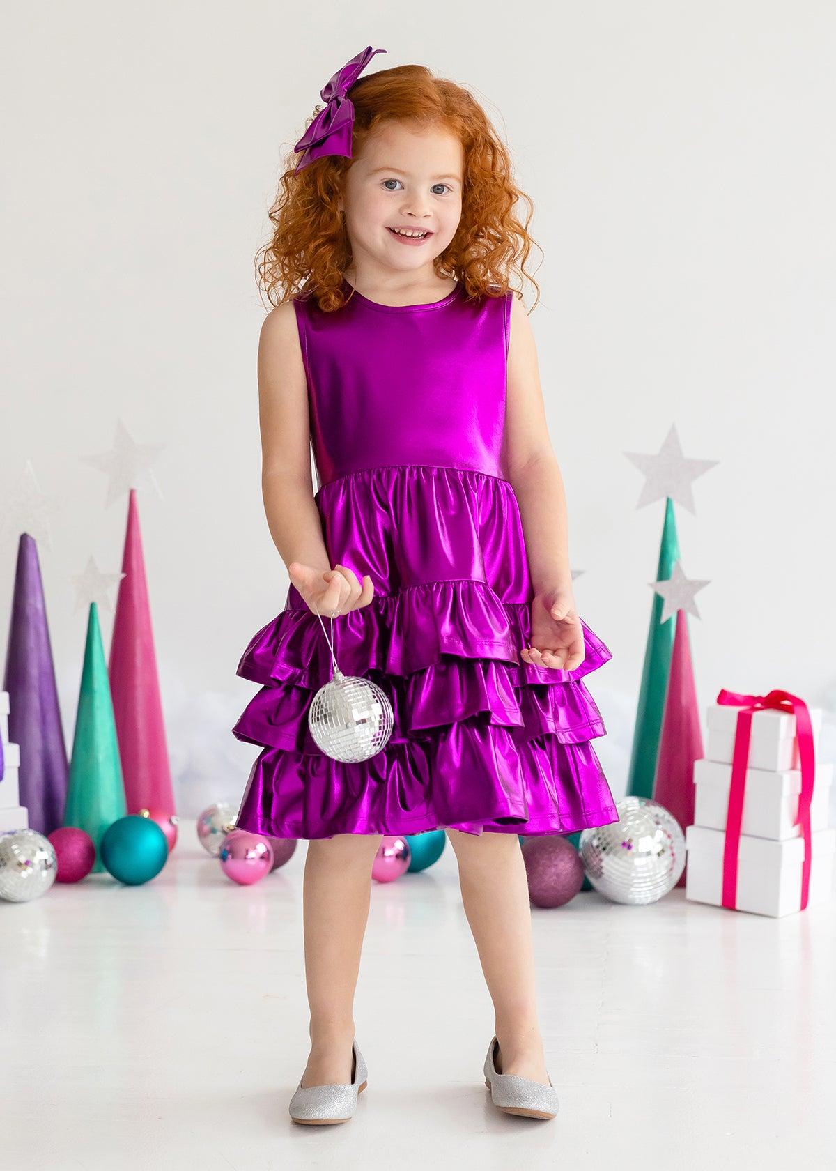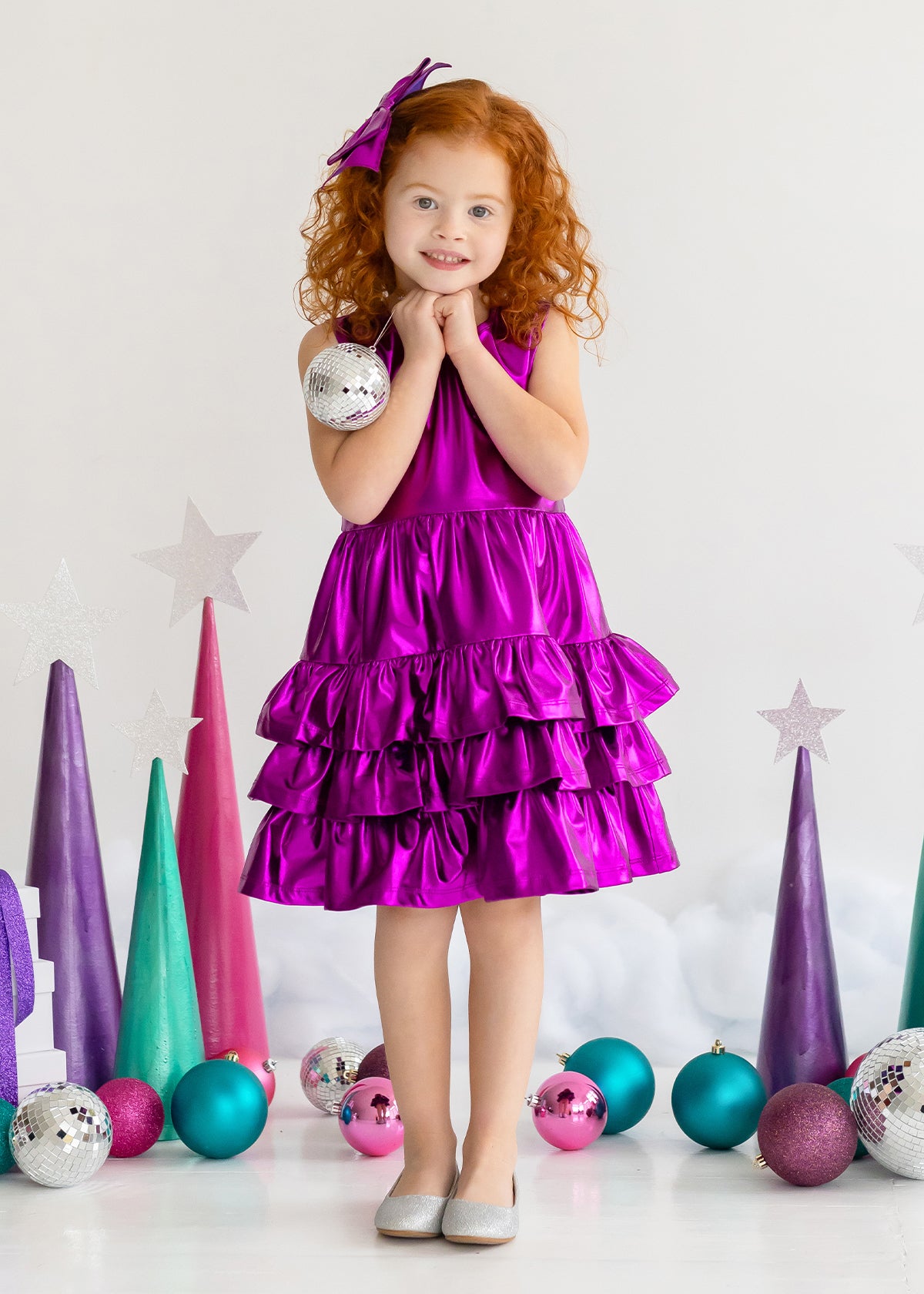 This stunning girl's dress features a vibrant, metallic purple fabric that catches the light beautifully. The sleeveless design is perfect for warmer days, while the triple-tiered ruffle skirt adds volume and movement for a twirl-worthy look. The dress fastens at the back with a button, ensuring a comfortable fit for your little one. Ideal for special occasions.
