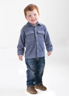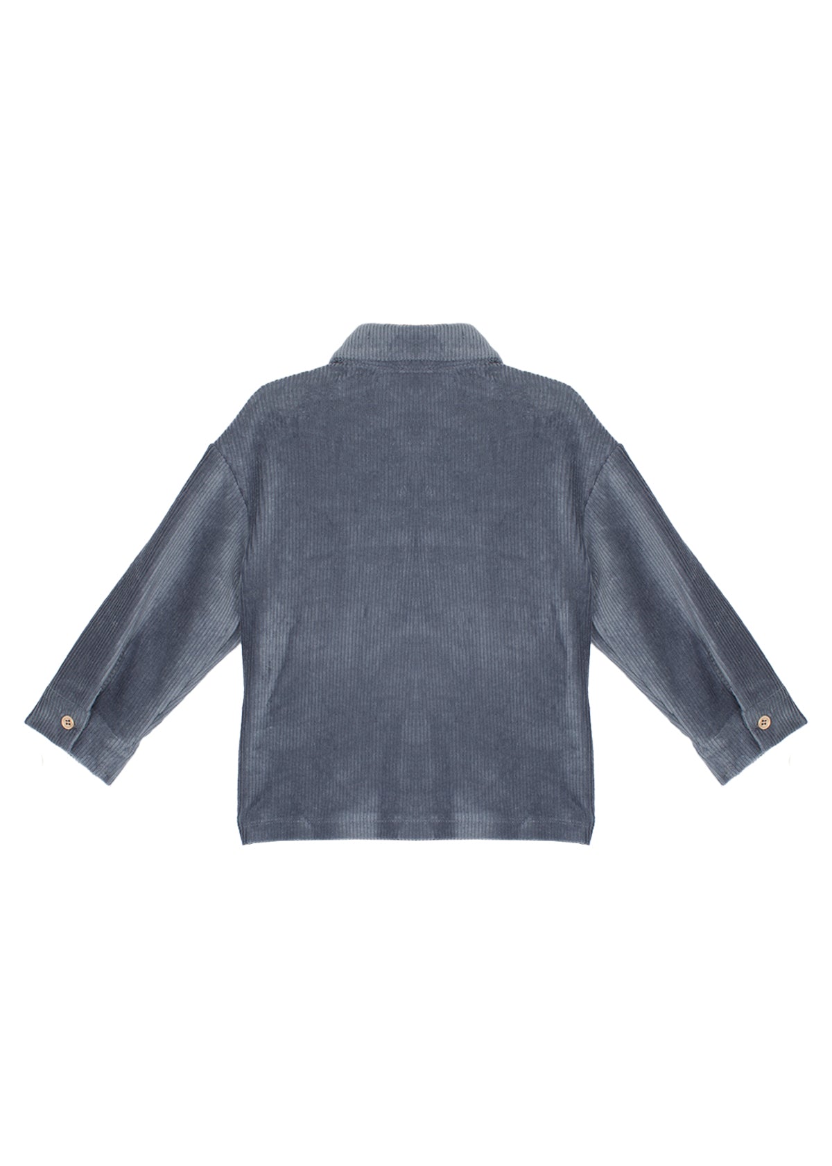 This stylish boys' top features a warm, soft corduroy fabric in a sophisticated slate blue color. The shirt is designed with a classic button-down front and dual chest pockets for a touch of utility and charm. Its long sleeves and relaxed fit make it perfect for layering on cool days.