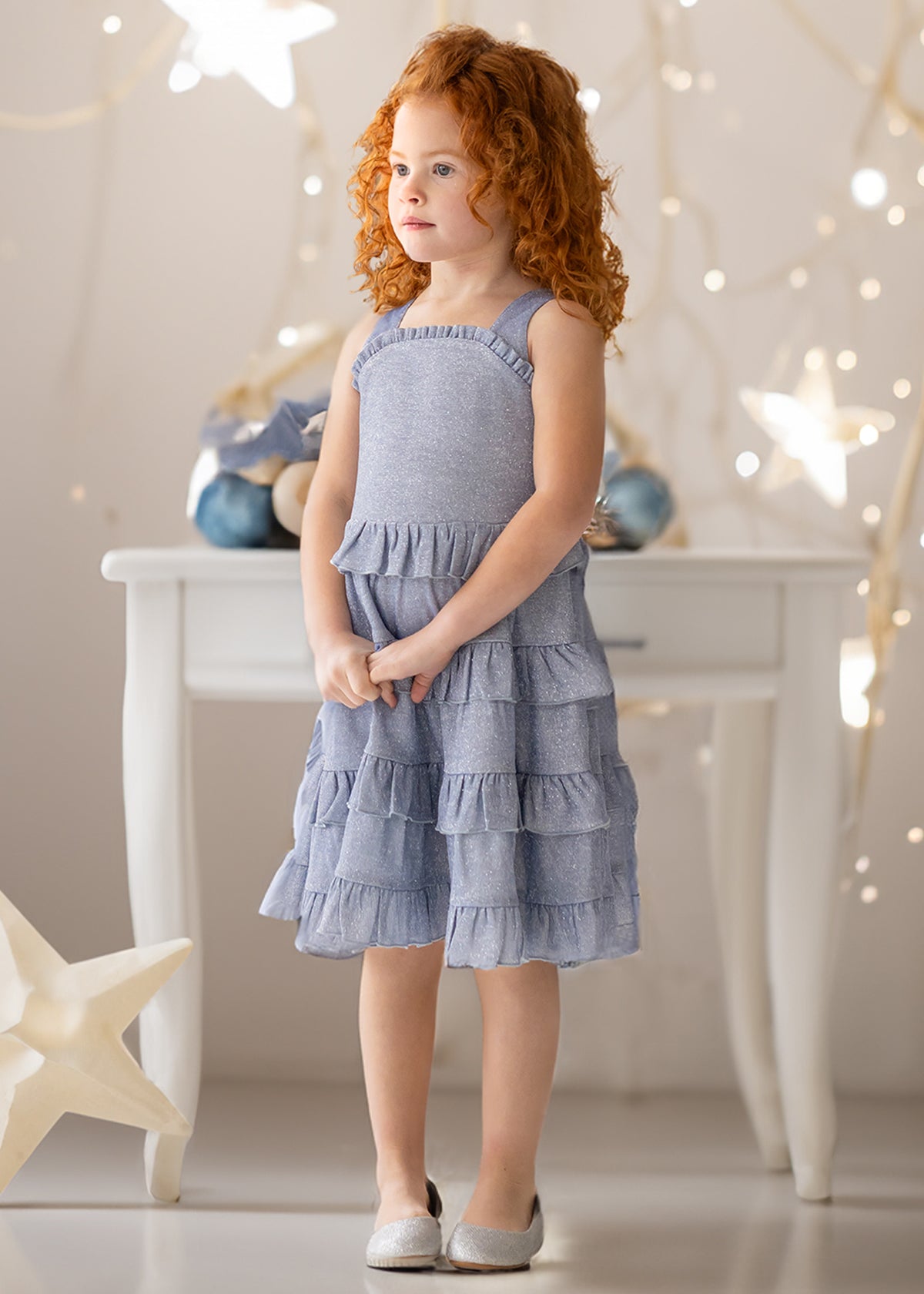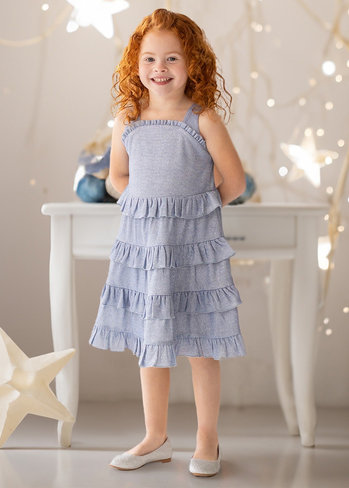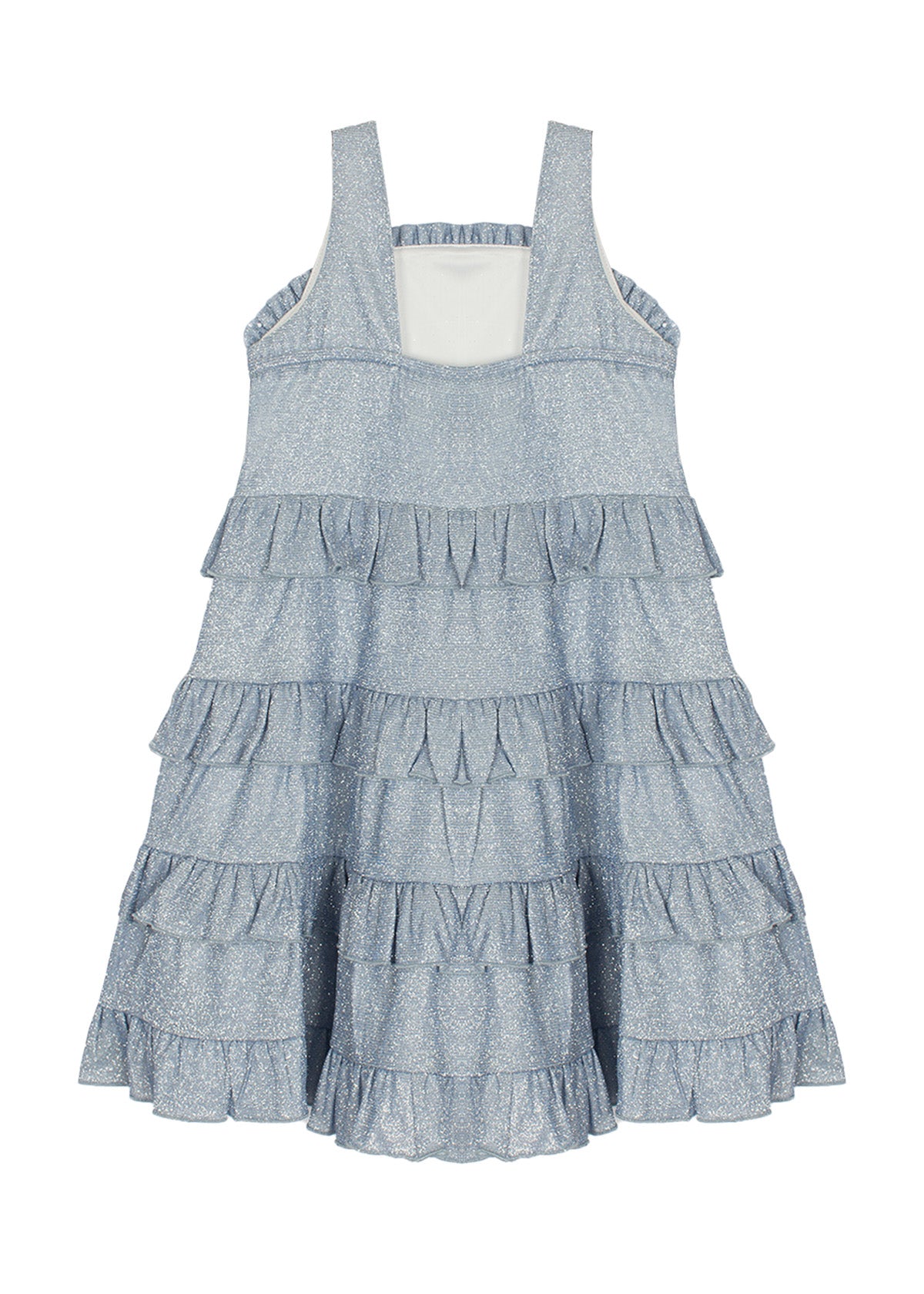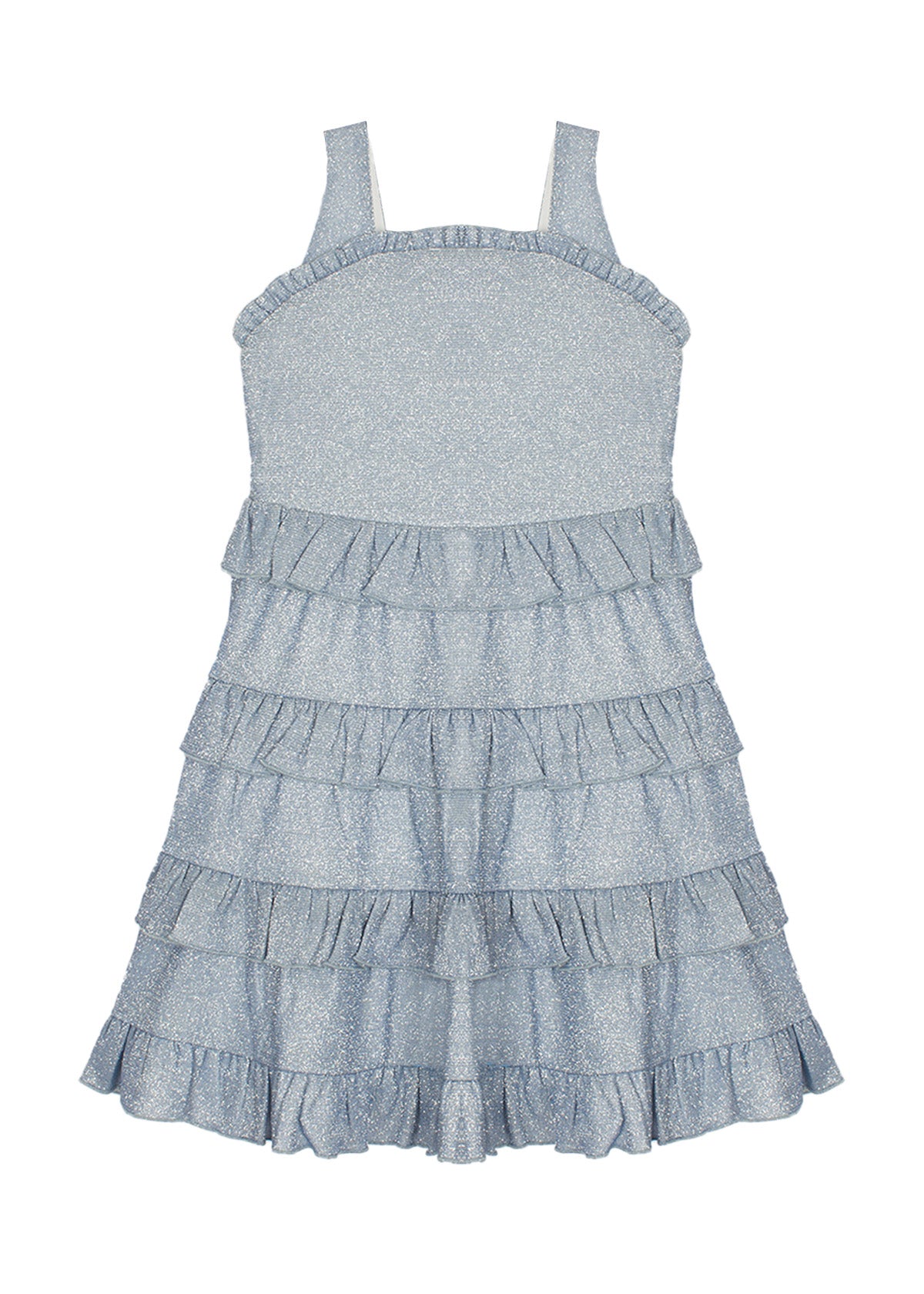 This girl's dress sparkles in a soft, shimmering blue fabric that catches the light beautifully. The sleeveless design is complemented by delicate ruffledneckline, while the tiered skirt adds playful volume with each layer. Perfect for special occasions, this dress offers a blend of elegance and fun with its sparkling finish and flattering silhouette.