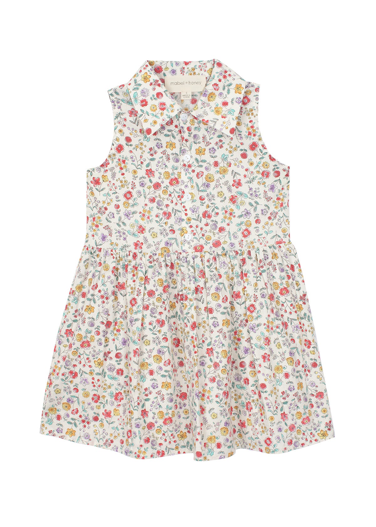 This charming girl's dress showcases a delightful floral print in vibrant hues of red, yellow, purple, and green. Crafted from a lightweight fabric, it features a classic collared neckline and a sleeveless design. The gathered waist and button-front closure add elegant touches, making it perfect for warm-weather outings.