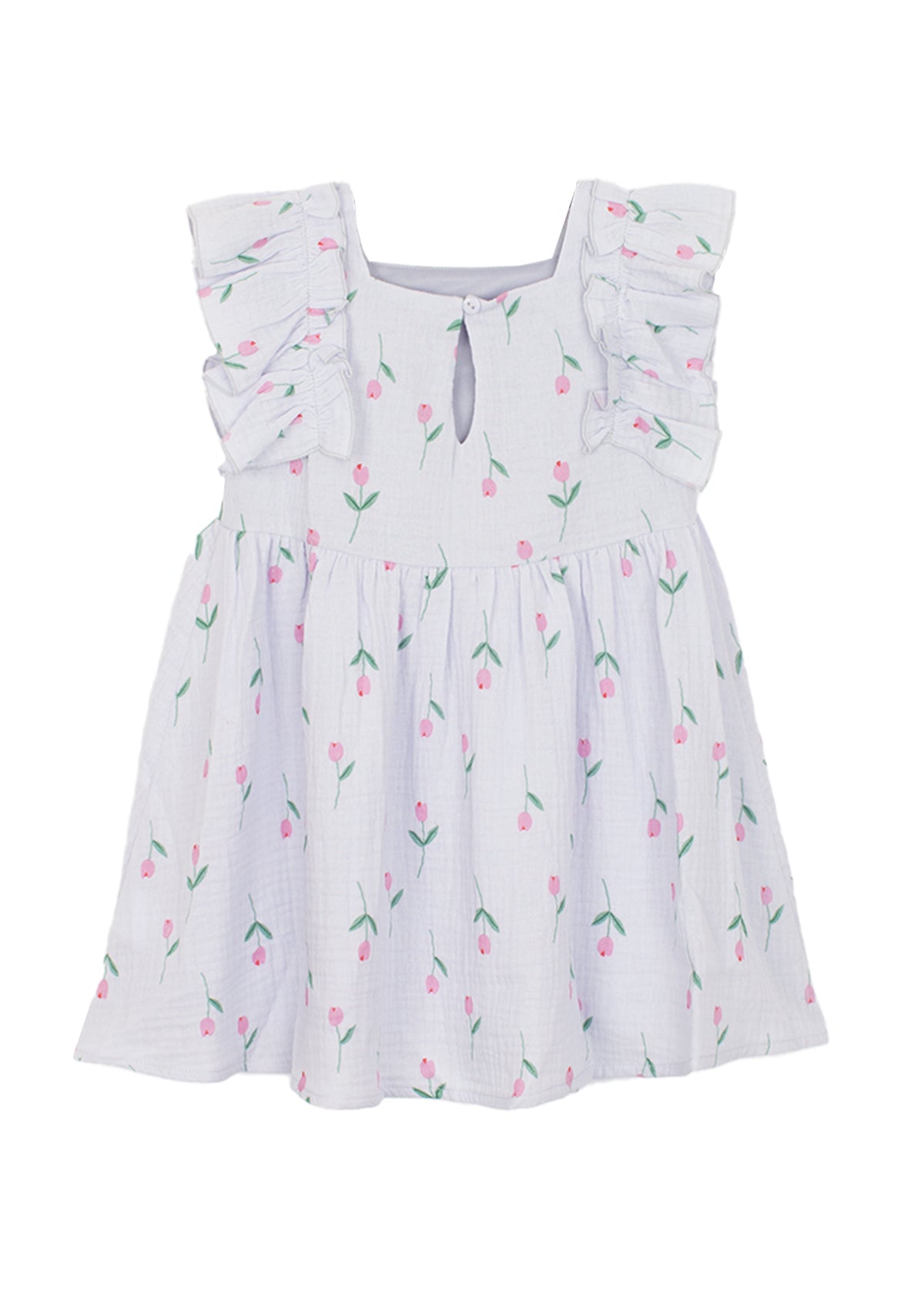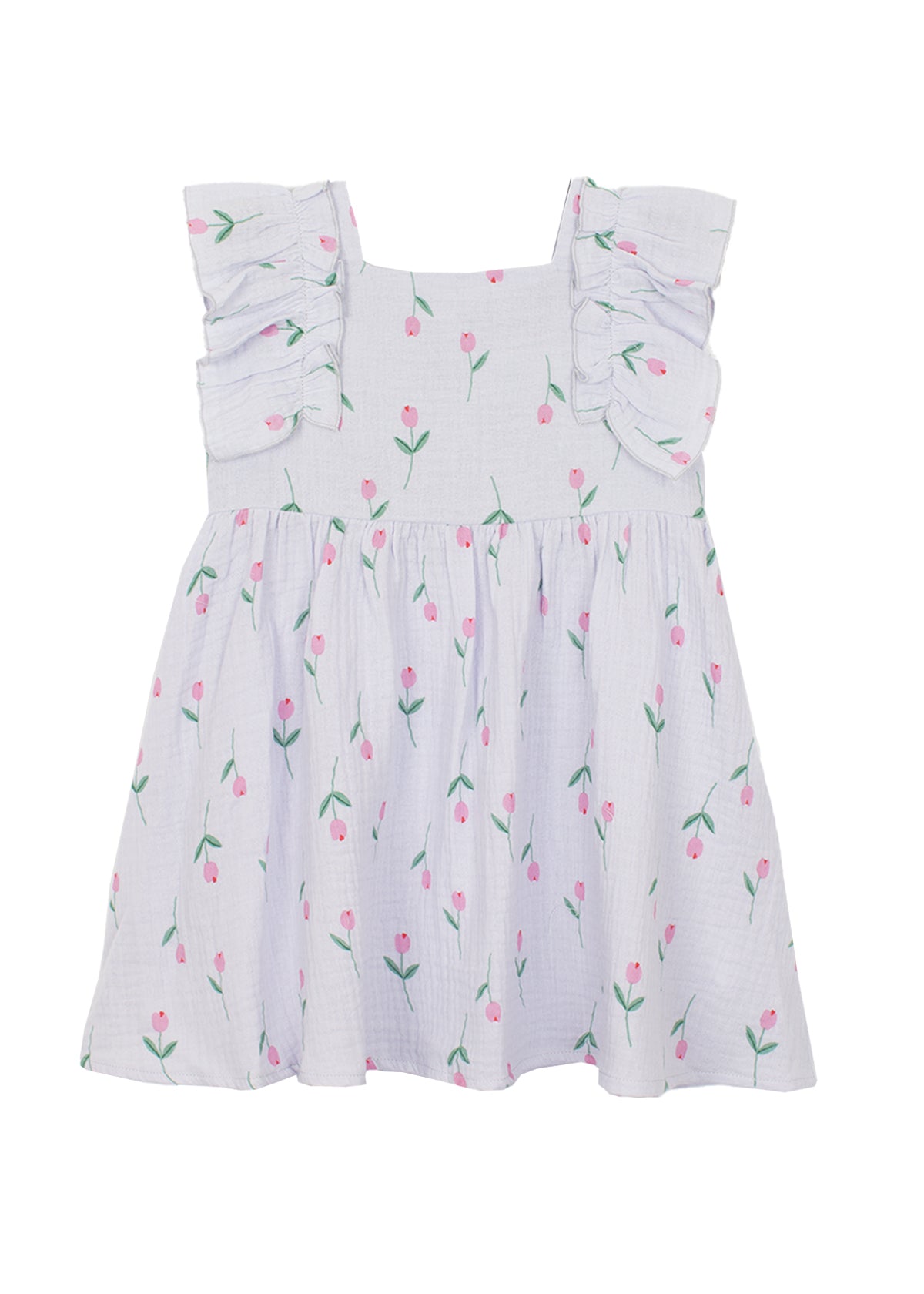 This sweet girl's dress features a soft lavender fabric adorned with delicate pink tulips. The dress is designed with charming ruffle sleeves and a gathered waist for a playful, elegant look. Perfect for any occasion, this dress combines comfort and style, making it ideal for both casual outings and special events.