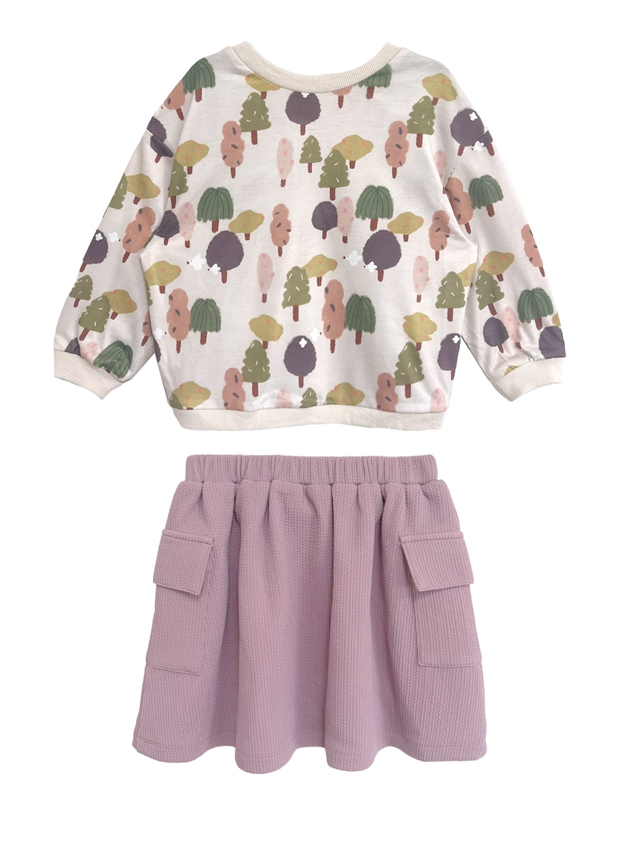 The Treehouse two piece set by Mabel and Honey is the perfect blend of playful charm and everyday comfort. The long-sleeved top features a whimsical tree pattern in soft pastel hues of green, pink, purple, and yellow on a cream-colored background, complete with ribbed cuffs and hem for a snug fit. Pair it effortlessly with the light purple A-line skirt, made from textured fabric and designed with functional side flap pockets. Together, this coordinated set creates a delightful and versatile outfit for your little adventurer!