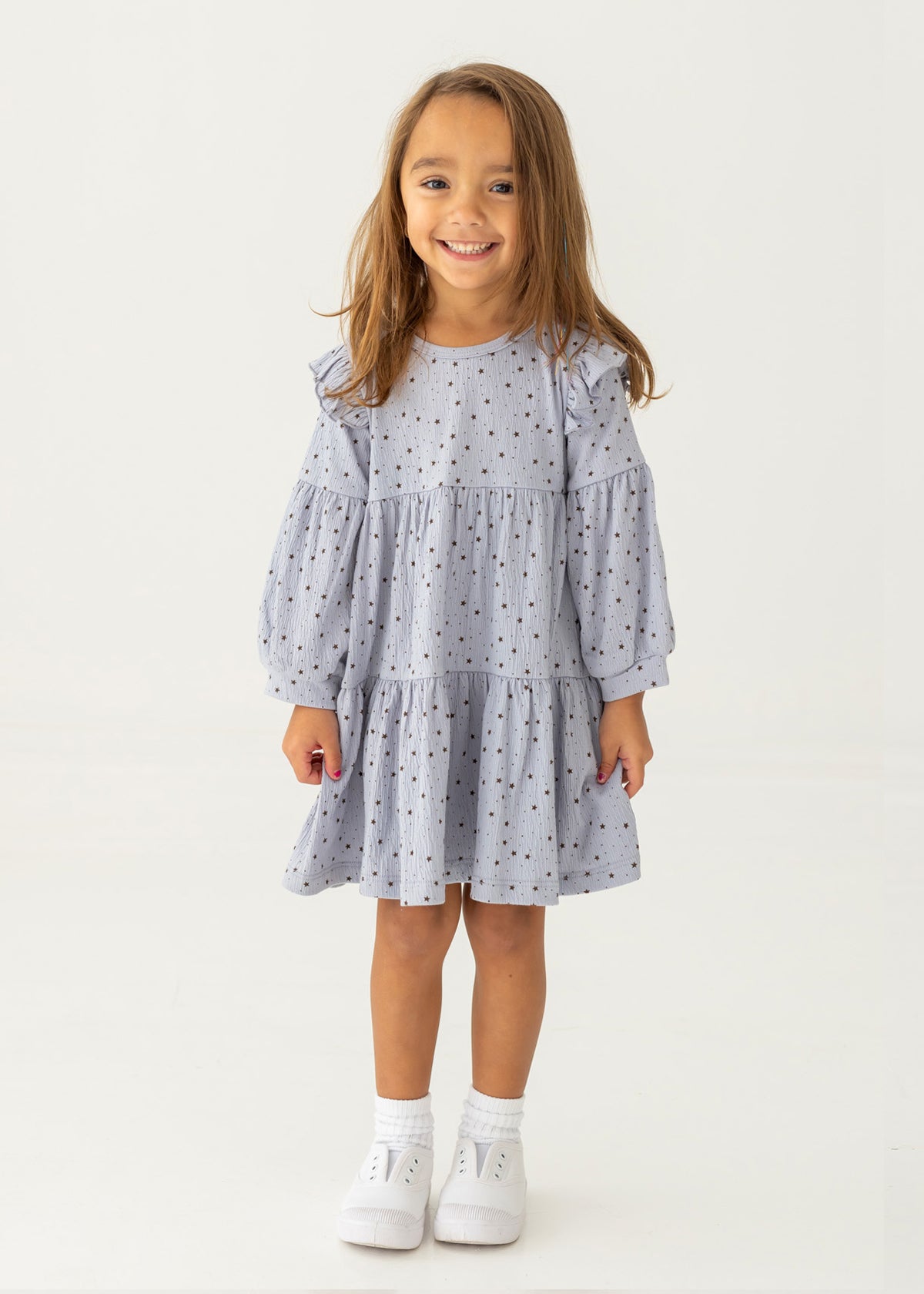 This adorable girl's dress comes in a soft blue shade, accented with playful black polka dots. The dress features long sleeves with elastic cuffs and charming ruffle details at the shoulders. Its tiered skirt adds a touch of volume, making it perfect for twirling, while the relaxed fit ensures comfort for all-day wear.