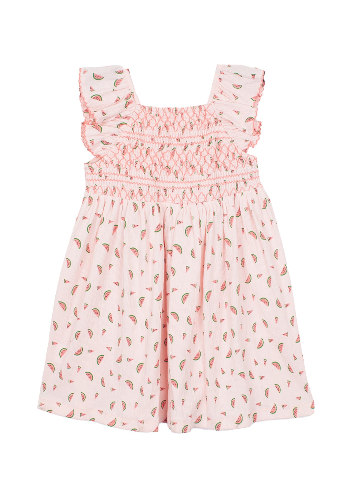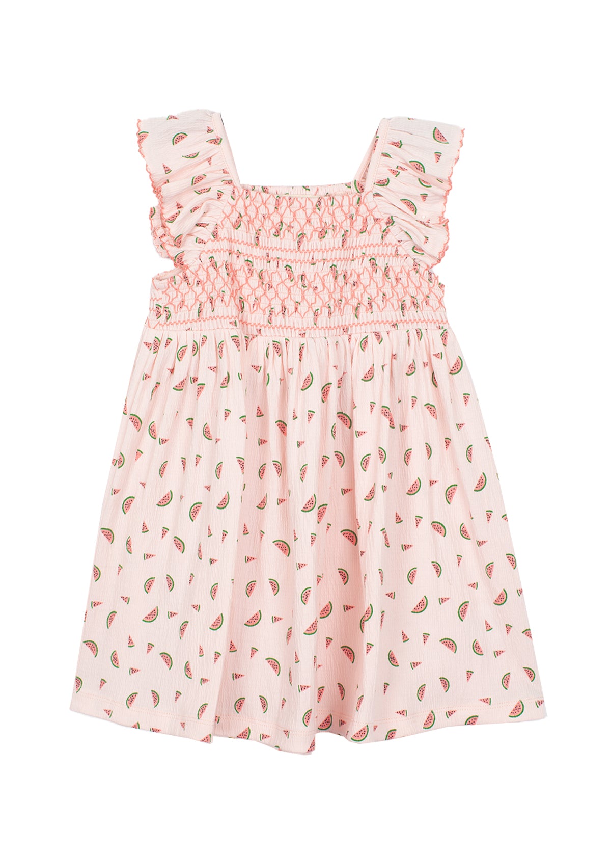This light pink dress features a playful watermelon print on soft, woven fabric for a breezy feel. The smocked bodice provides a flexible, comfortable fit, while ruffled shoulder straps add a sweet touch. A flowy gathered skirt completes the look, making it perfect for warm-weather adventures.