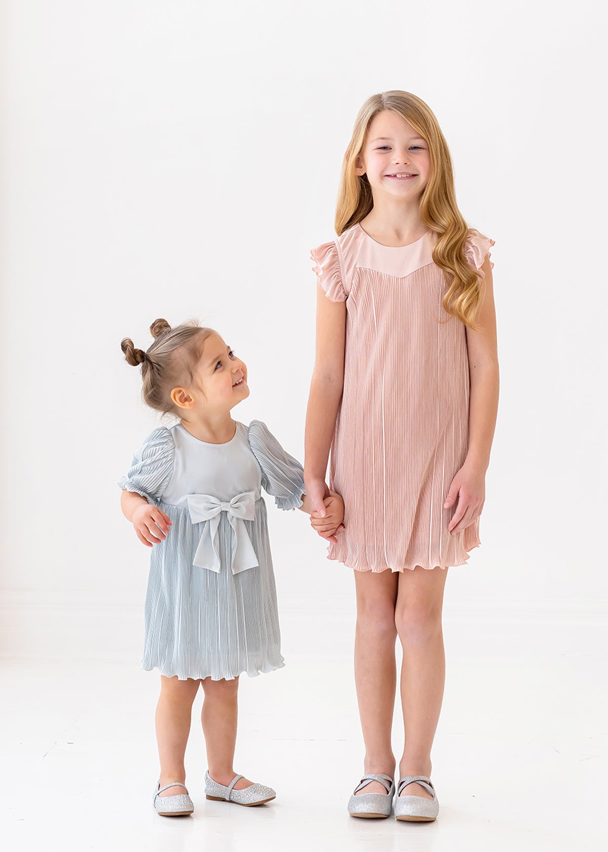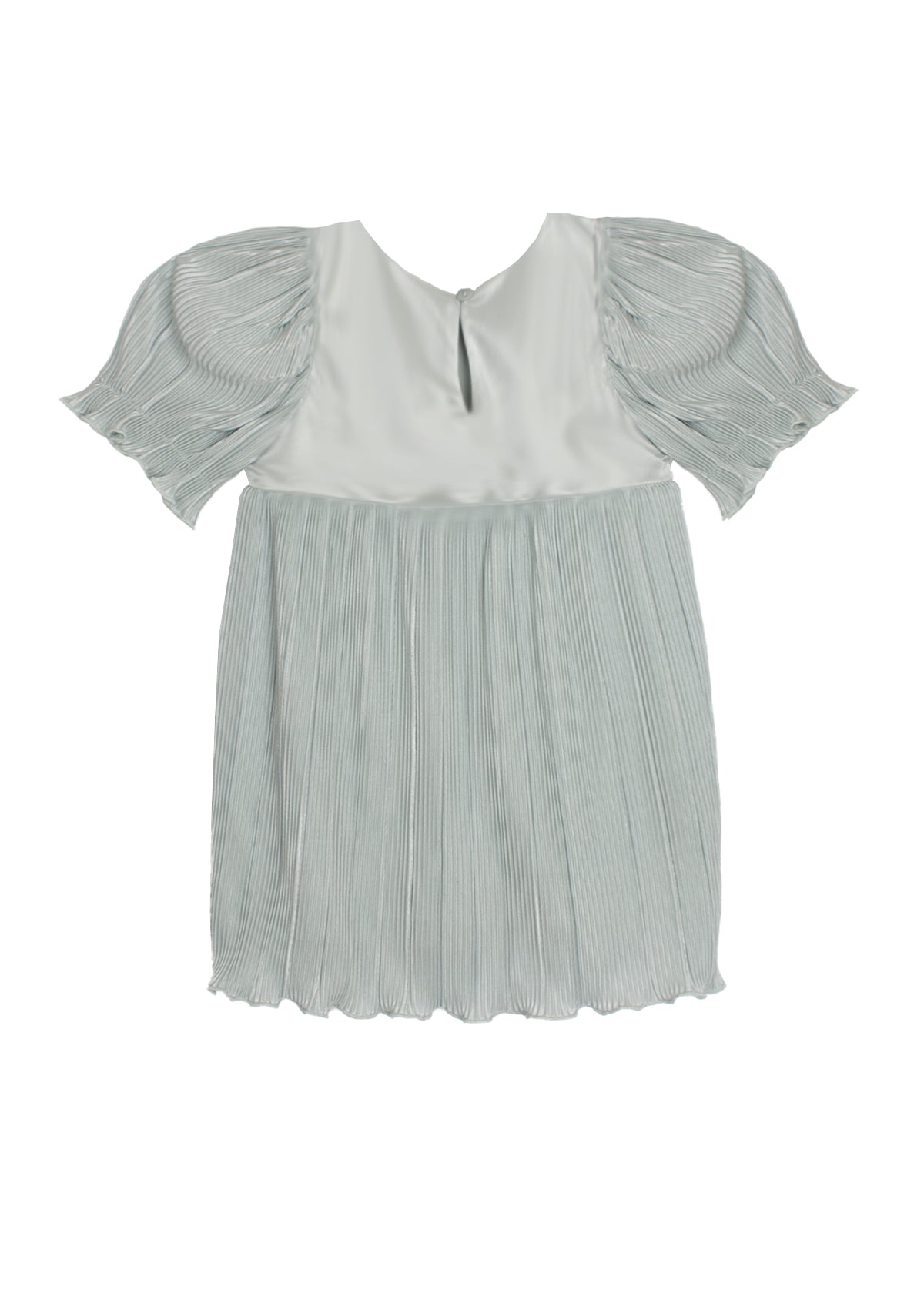This girl's dress features an elegant design with soft, pleated fabric in a soothing light blue hue. The dress showcases puffed short sleeves and a delicate bow at the waist, adding a touch of charm. The lightweight material and flowing skirt create a graceful silhouette, perfect for special occasions or dress-up play.