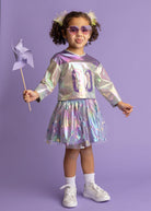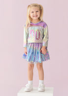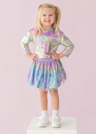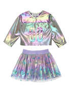 Light up her wardrobe with the Gametime Butterfly two piece set! This iridescent ensemble features a metallic long-sleeve top with sporty detailing paired with a twirl-worthy tulle skirt adorned with colorful butterfly patterns. Radiating vibrant shades of pink, green, blue, and purple, this set is perfect for special occasions or everyday dazzling fun.