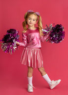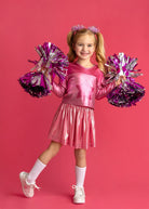 Make a bold statement with the Gametime Star 2PC Set in metallic pink! This shimmery long-sleeve top features a standout star applique at the chest, perfectly paired with a matching elastic-waist gathered skirt. Designed for twirling, shining, and standing out, this chic combo is perfect for playful days or special occasions.