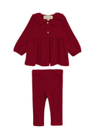 The Rosie two piece set is the epitome of comfort and style for your little one. This delightful set features a long-sleeved top with a sweet ruffled collar and button details, paired with matching ribbed leggings for a cozy coordinated look. Its deep red hue adds warmth and elegance, making it a standout addition to your babys wardrobe. Effortless and adorable!