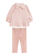 The Serena two piece set combines comfort and style with its light pink textured long-sleeve top, complete with a classic collar, a buttoned placket, and an elegant pleated hem. Paired with simple elastic-waistband leggings for all-day ease, this set is perfect for playful days or picture-perfect moments. Designed for versatility and charm, it?s a wardrobe essential for little ones.