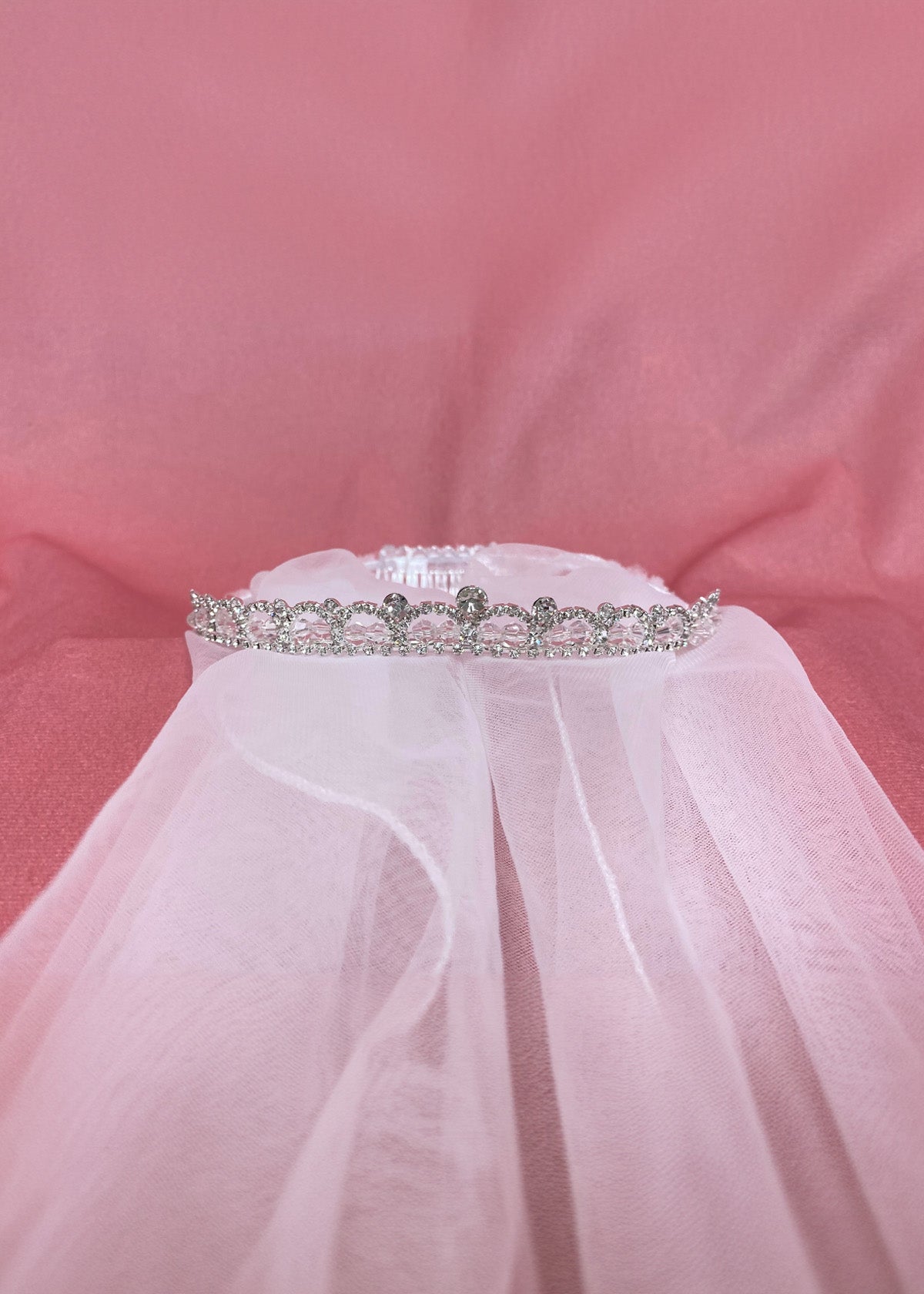 This white tulle communion crown veil features a delicate rhinestone tiara that adds a radiant touch. The sheer fabric flows gracefully, creating a graceful effect. Designed with an attached comb for a secure fit, this elegant veil beautifully complements any special occasion attire with its timeless and refined style.