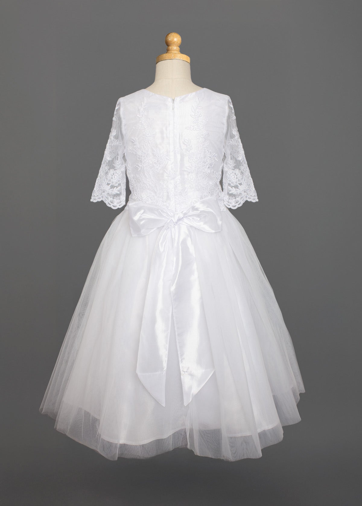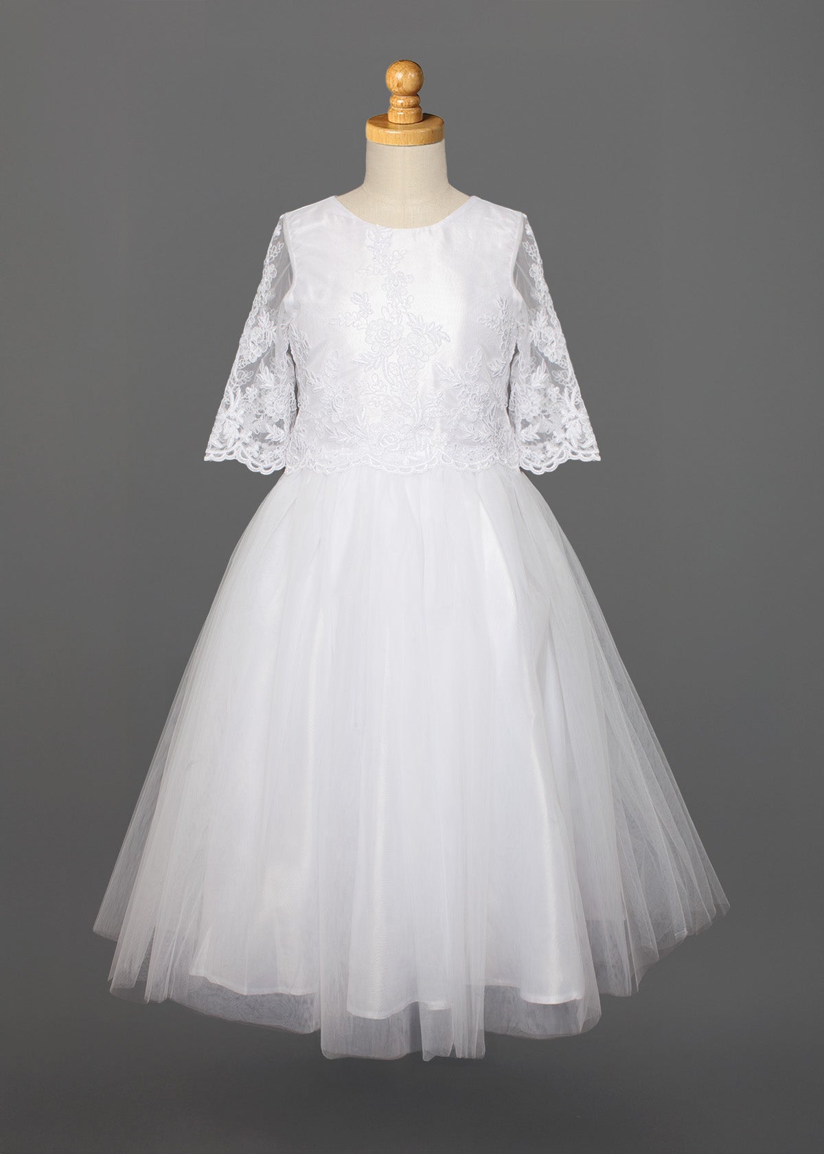 This white communion dress combines elegance and grace with its lace bodice and three-quarter bell sleeves featuring intricate floral patterns. The layered tulle skirt adds volume and a soft, ethereal look, while the scalloped lace hem of the bodice completes the design, making it a perfect choice for a special occasion.
