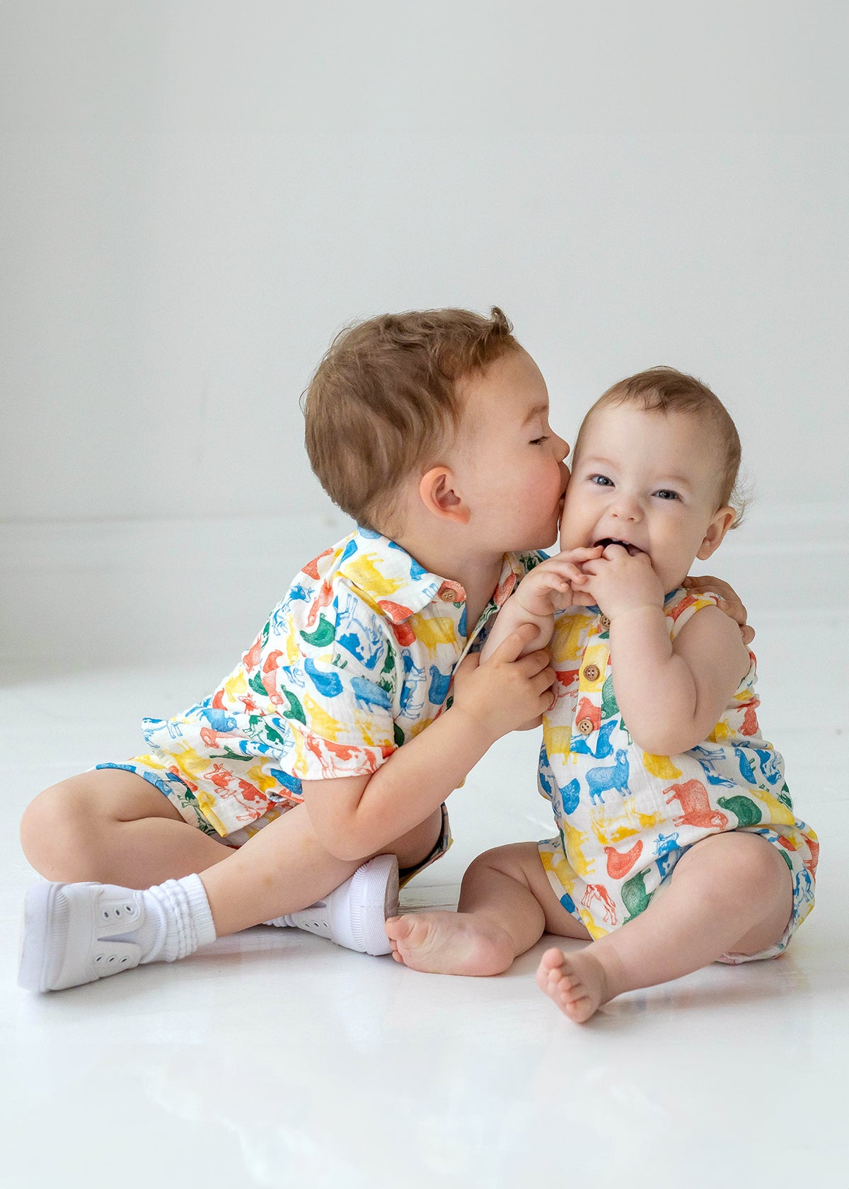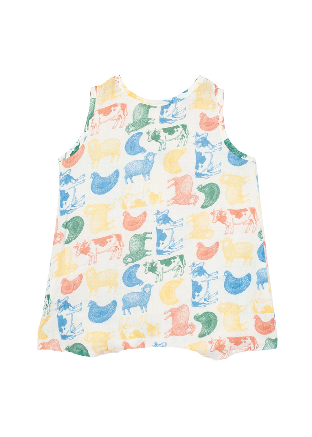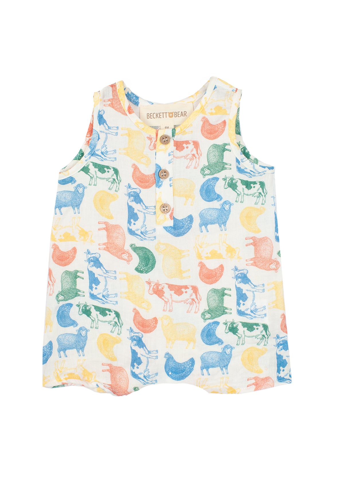 This sleeveless romper features a playful multicolored farm animal print on soft, woven fabric for a lightweight and breathable feel. The henley-style button placket adds a classic touch, while the relaxed fit ensures all-day comfort. Perfect for little ones on the move, this romper is both stylish and practical.