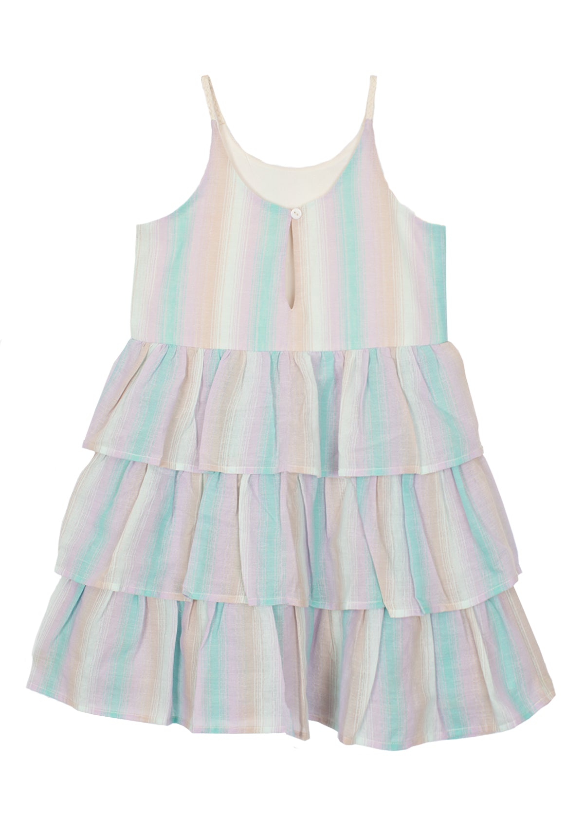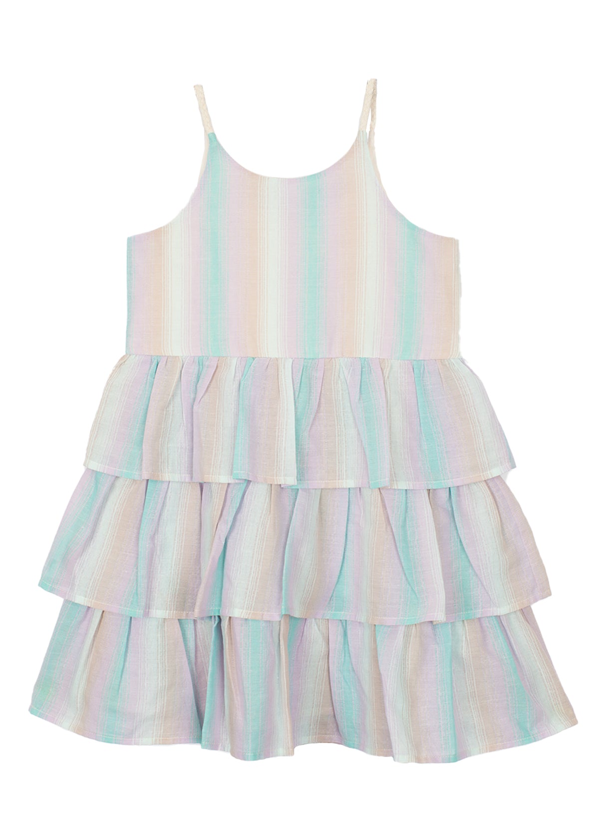 This girls' dress features a dreamy pastel rainbow stripe pattern on lightweight woven fabric. Designed with delicate spaghetti straps and a flowy tiered silhouette, it offers an effortlessly breezy feel. The soft hues and airy layers create a playful yet elegant look, perfect for warm-weather adventures with all-day comfort.