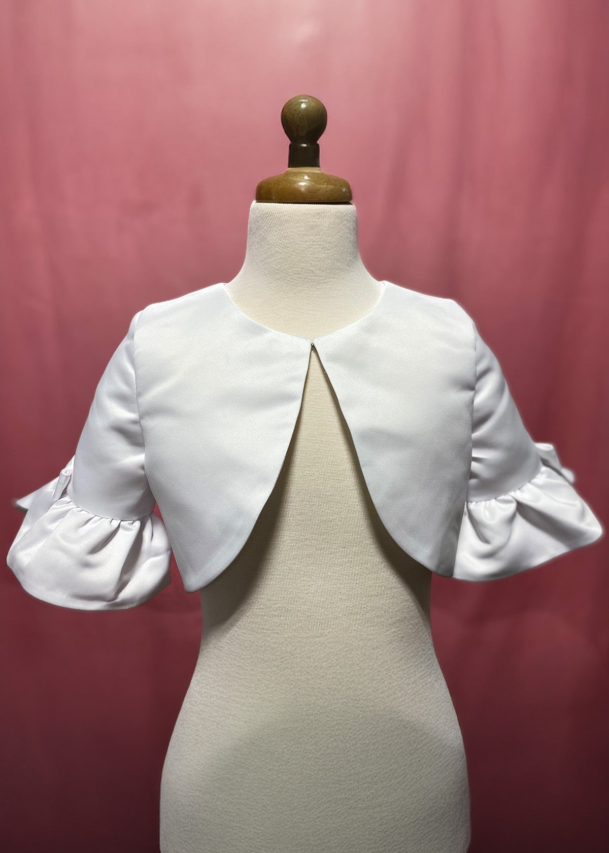 This white satin communion bolero adds a graceful touch to any special occasion outfit. Designed with a soft, smooth finish, it features three-quarter sleeves adorned with delicate ruffle details. The open front allows for effortless layering, making it a beautiful complement to dresses for added elegance.