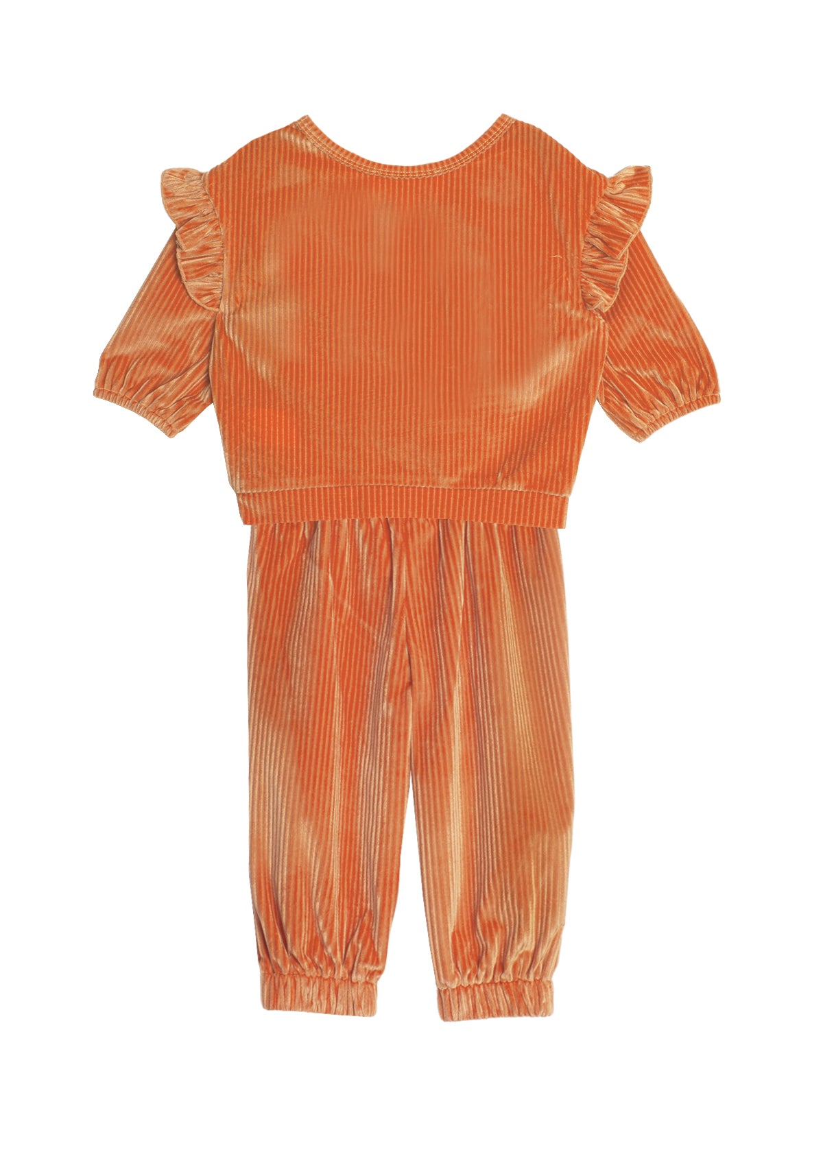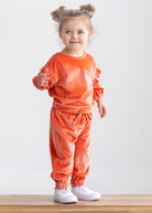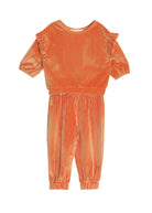 This girl's two piece set features a luxurious, velvety texture in a warm, orange hue. The set includes a short-sleeve top with delicate ruffle accents on the shoulders, and matching elastic-waist pants. The rich color and soft fabric make this outfit both stylish and comfortable, perfect for any special occasion.