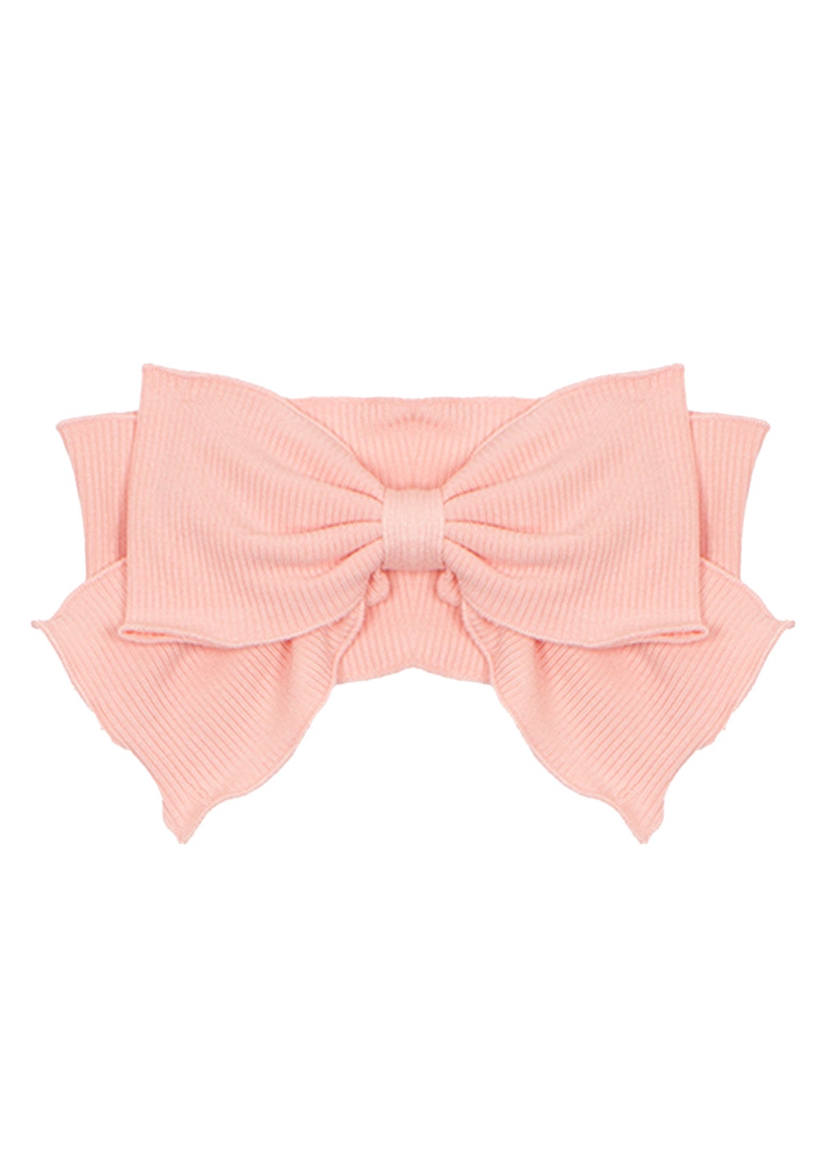 This baby girl's headband is crafted from a soft, ribbed knit fabric in a delicate blush pink hue. The wide, stretchy band ensures a comfortable fit, while the oversized bow adds a sweet touch. Designed with a structured shape, it keeps its form beautifully, making it a stylish finishing accessory.