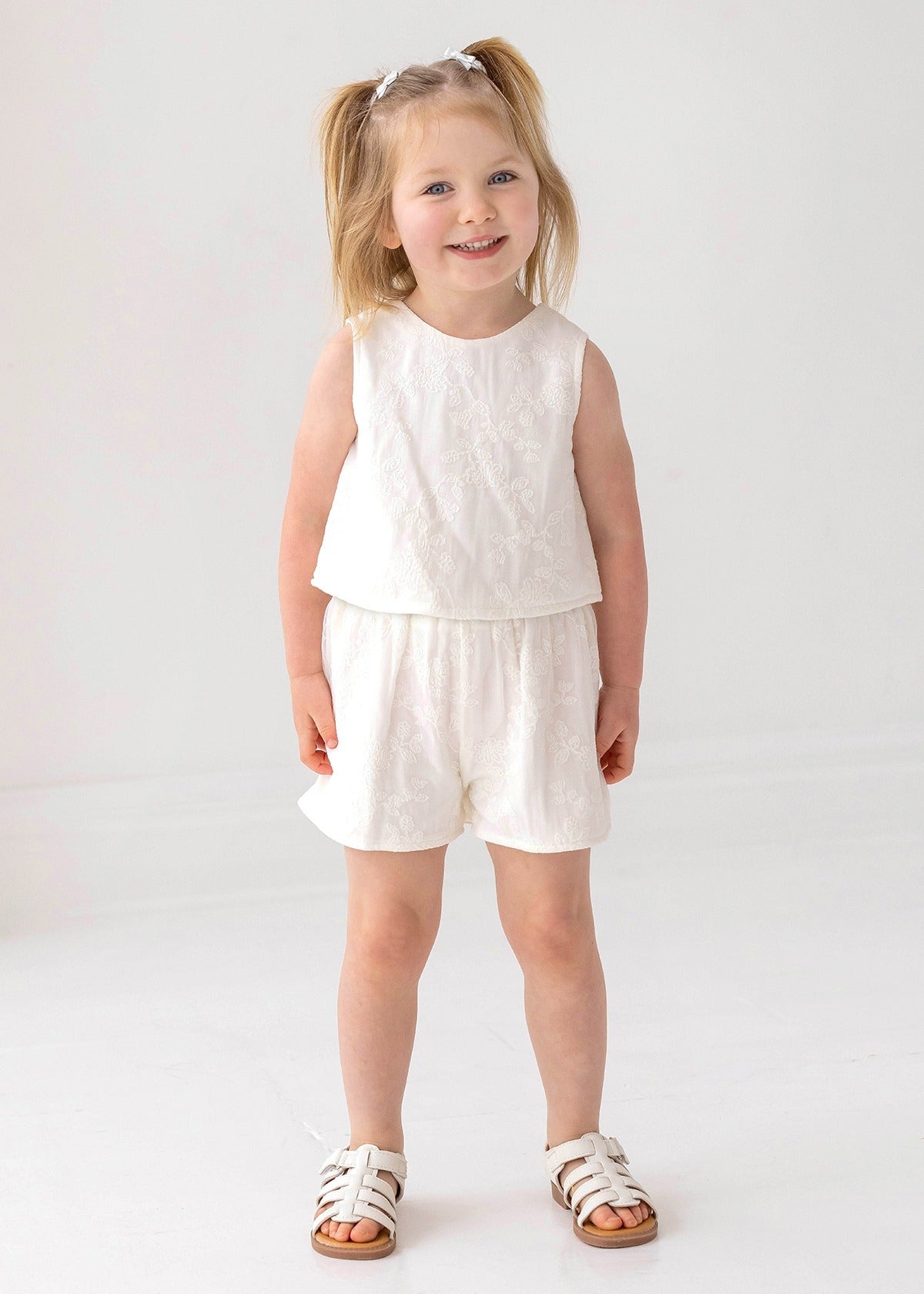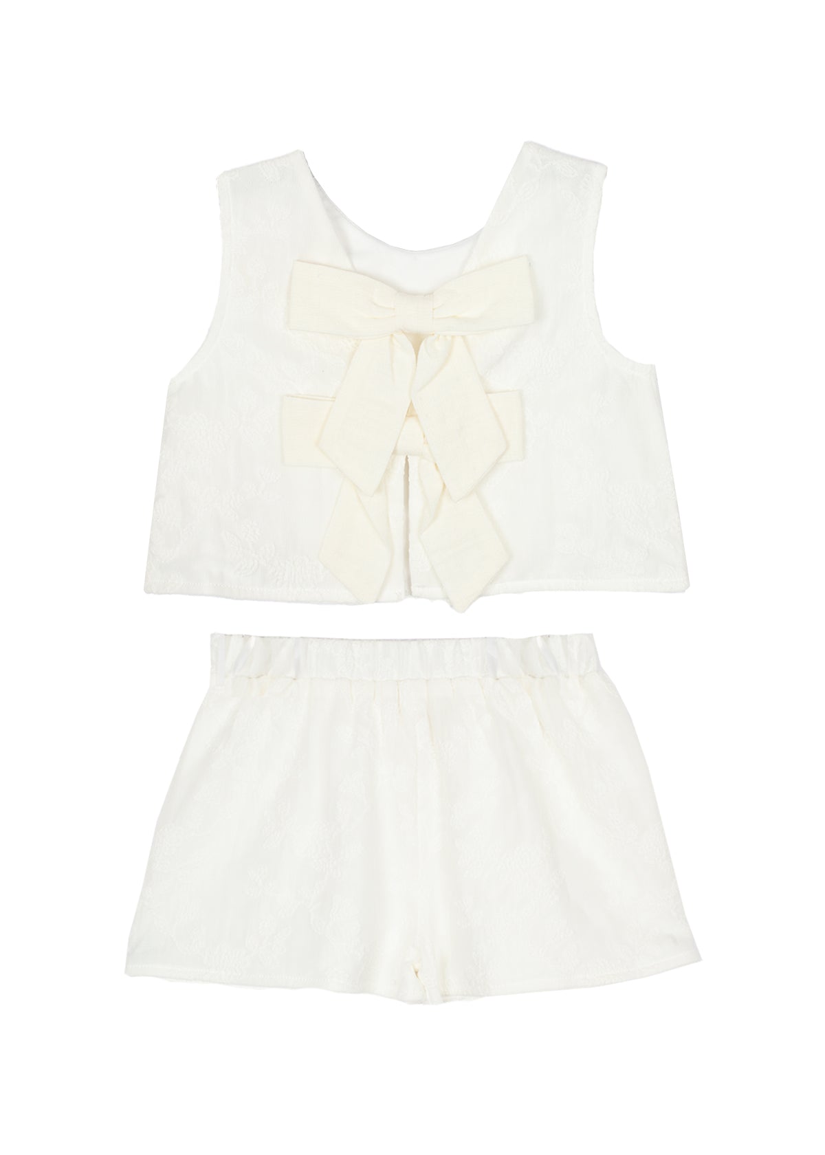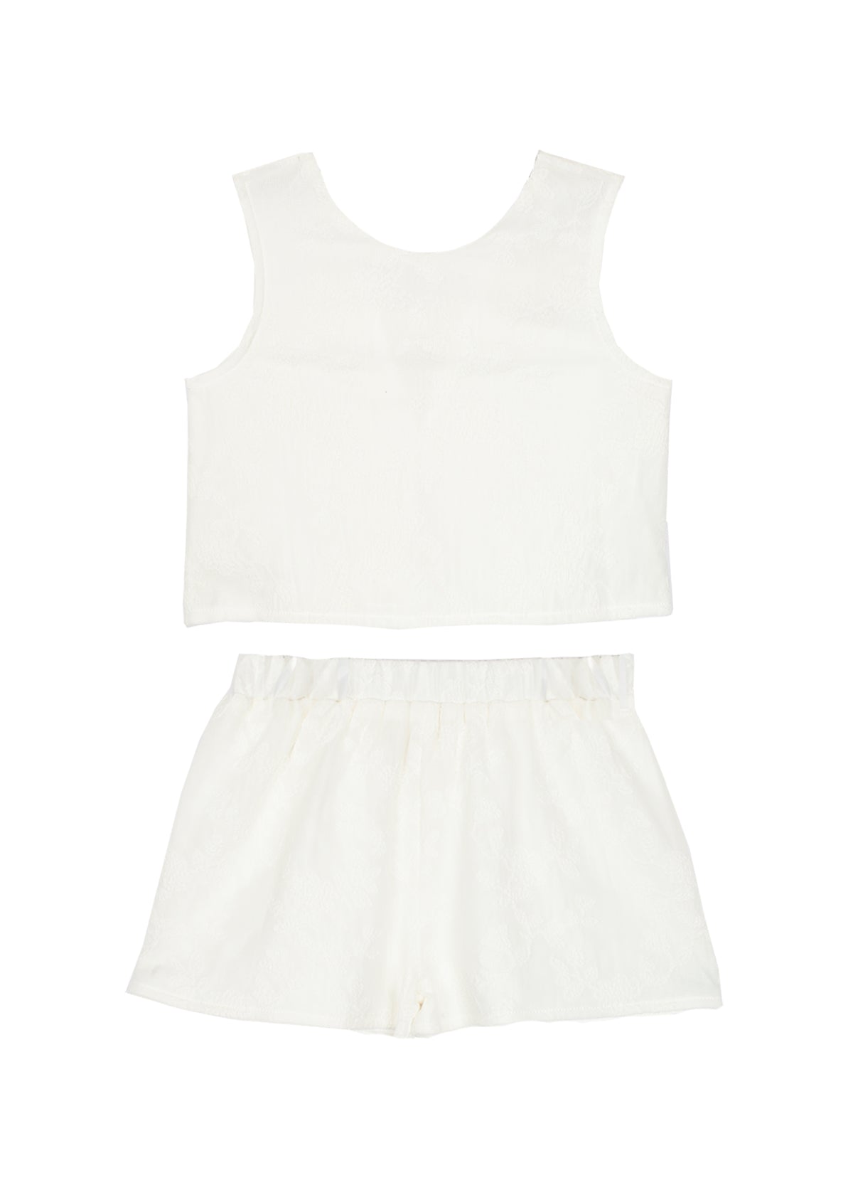 Elevate her wardrobe with this elegant ivory 2PC set, featuring a sleeveless top and matching shorts. Designed with a delicate lace overlay, this lightweight ensemble offers style and comfort. The matching short elastic waistband ensures a flexible fit, making it perfect for warm-weather outings and special occasions alike.