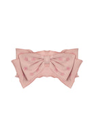 This adorable hair accessory features a soft, blush pink fabric with delicate embroidered floral details in a deeper pink hue. The large, beautifully crafted bow adds a sweet and elegant touch to any outfit. The elastic band ensures a secure and comfortable fit, making it perfect for both everyday wear and special occasions.