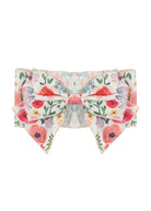 This vibrant headband features a colorful floral print in shades of pink, red, purple, and green on a lightweight chiffon fabric. The bow adds a playful touch to any outfit. The elastic band ensures a secure and comfortable fit, making it perfect for all-day wear.