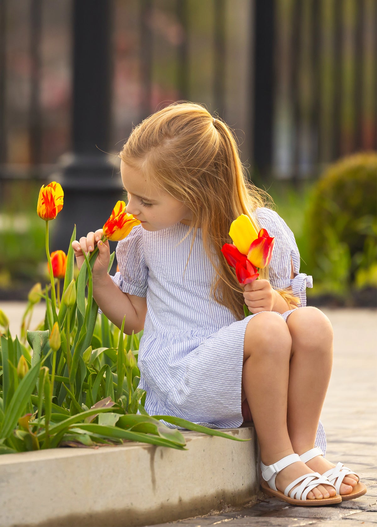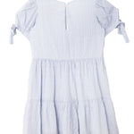 This perwinkle purple-blue dress features a vertical stripe pattern and a classic round neckline. The short sleeves are detailed with fabric ties, creating small bows for added style. A tiered, gathered skirt adds volume and movement, while the lightweight design ensures comfort.