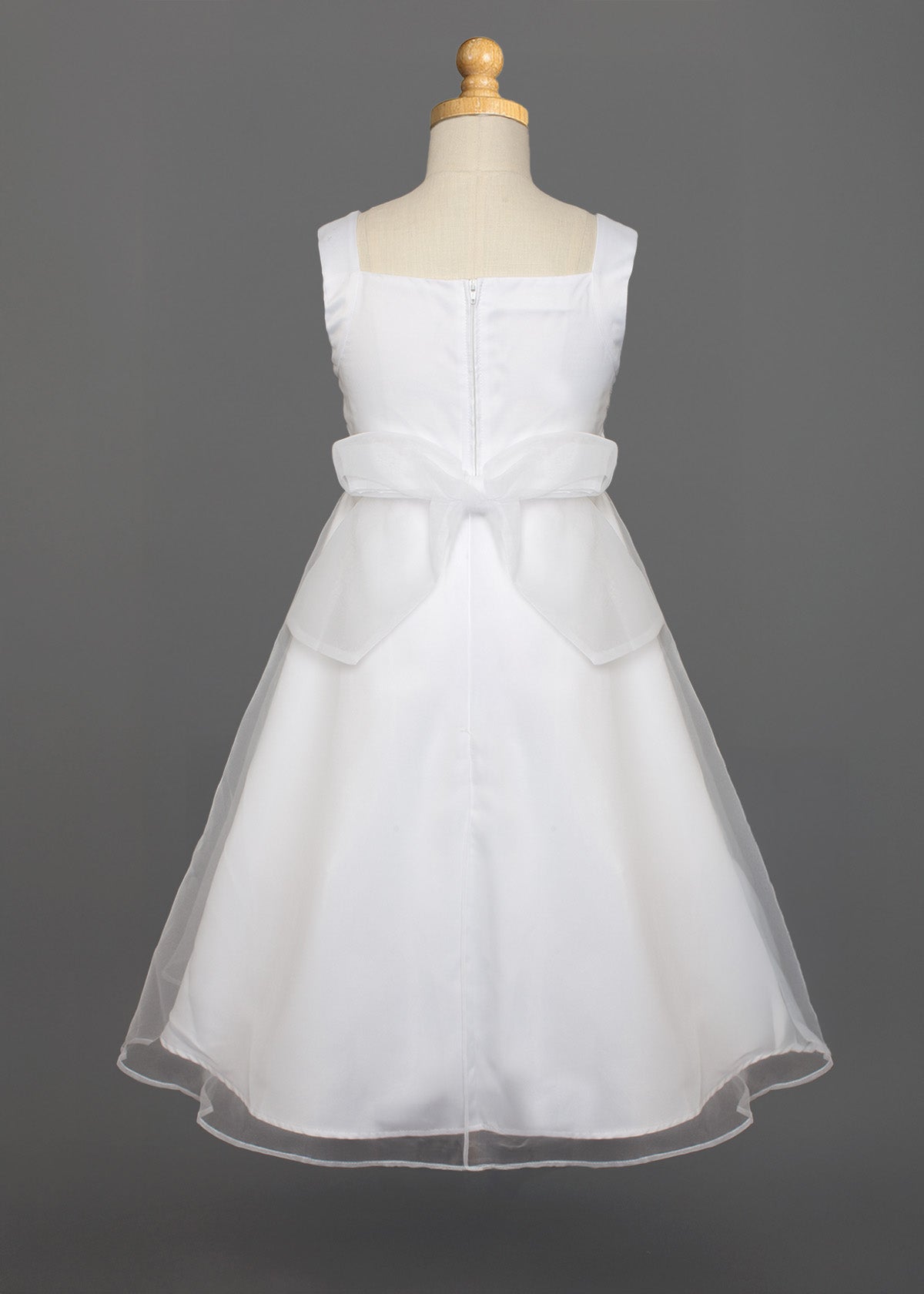 This white communion dress features a satin bodice beautifully embellished with intricate beadwork and floral embroidery. The wide straps provide a secure and elegant fit, while a satin waistband accentuates the design. The skirt is layered with a soft organza overlay, adding a touch of refinement for her special day.
