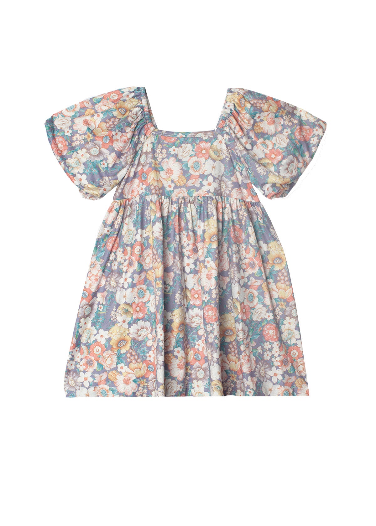 This delightful girl's dress features a soft, breathable fabric adorned with a vintage-inspired floral print in shades of blue, pink, and cream. The dress is designed with puffed short sleeves and a gathered waist, creating a charming silhouette. Perfect for special occasions or everyday wear, it offers both comfort and style for your little one.