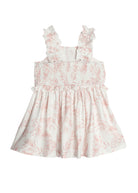 This Mabel and Honey sleeveless dress captures a breezy, tropical vibe with its delicate palm frond print in soft pink hues. The natural waist and gathered skirt create a flattering silhouette, while the ruffled accents add a touch of whimsy. It's made from a comfortable, breathable cotton fabric perfect for warm days.