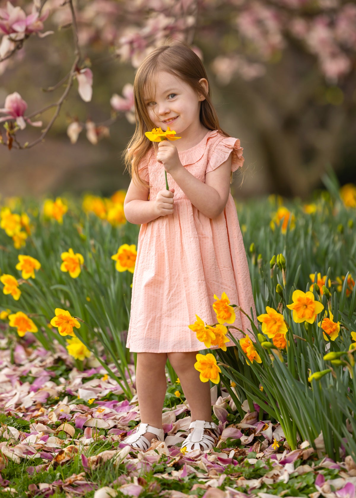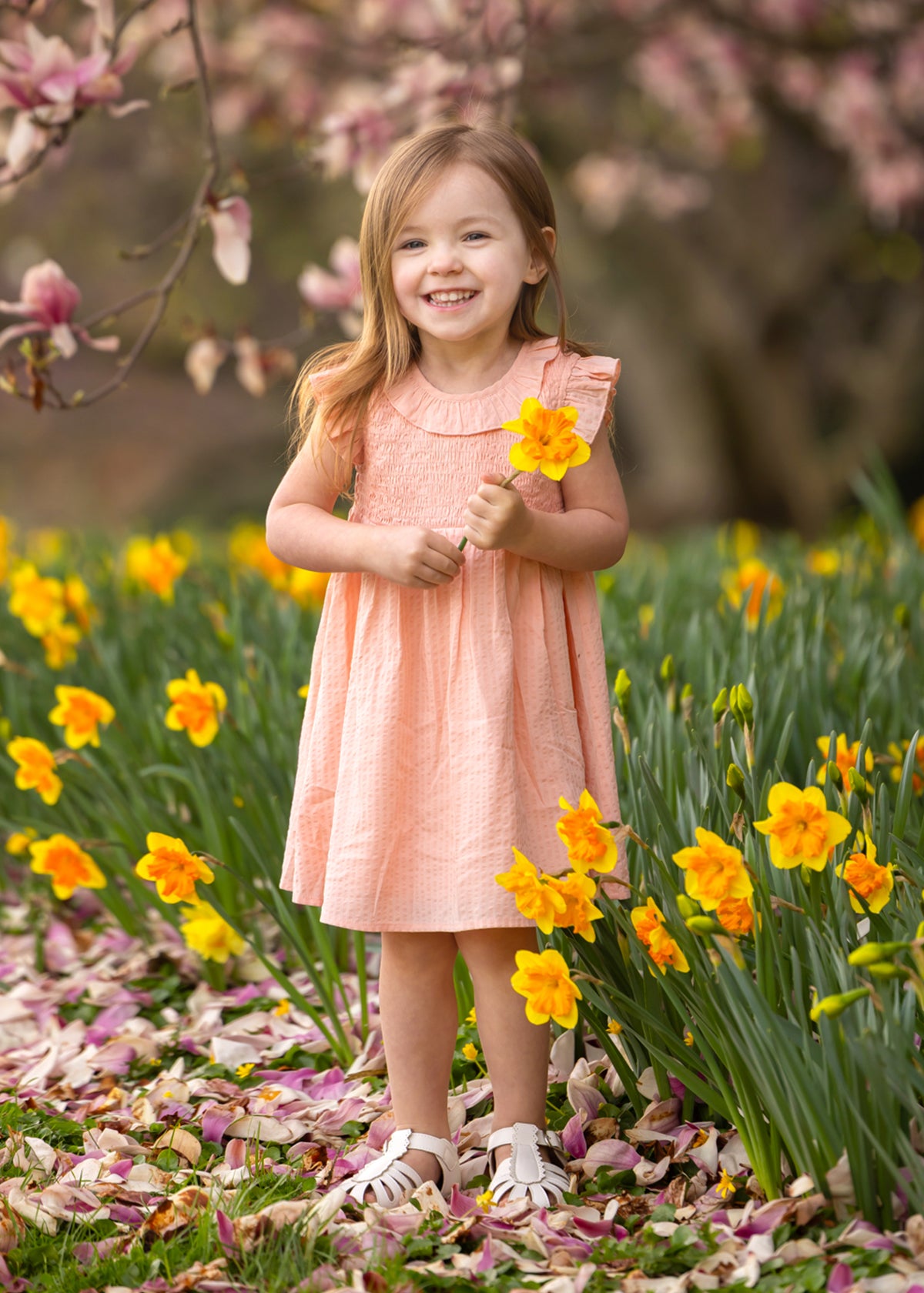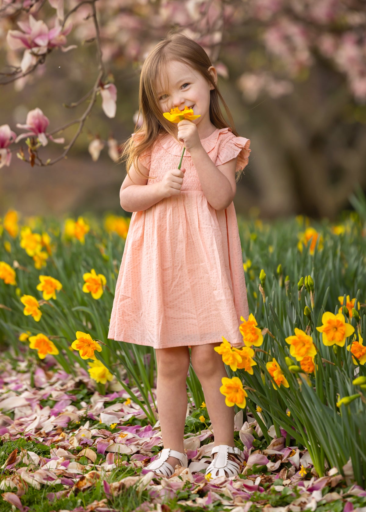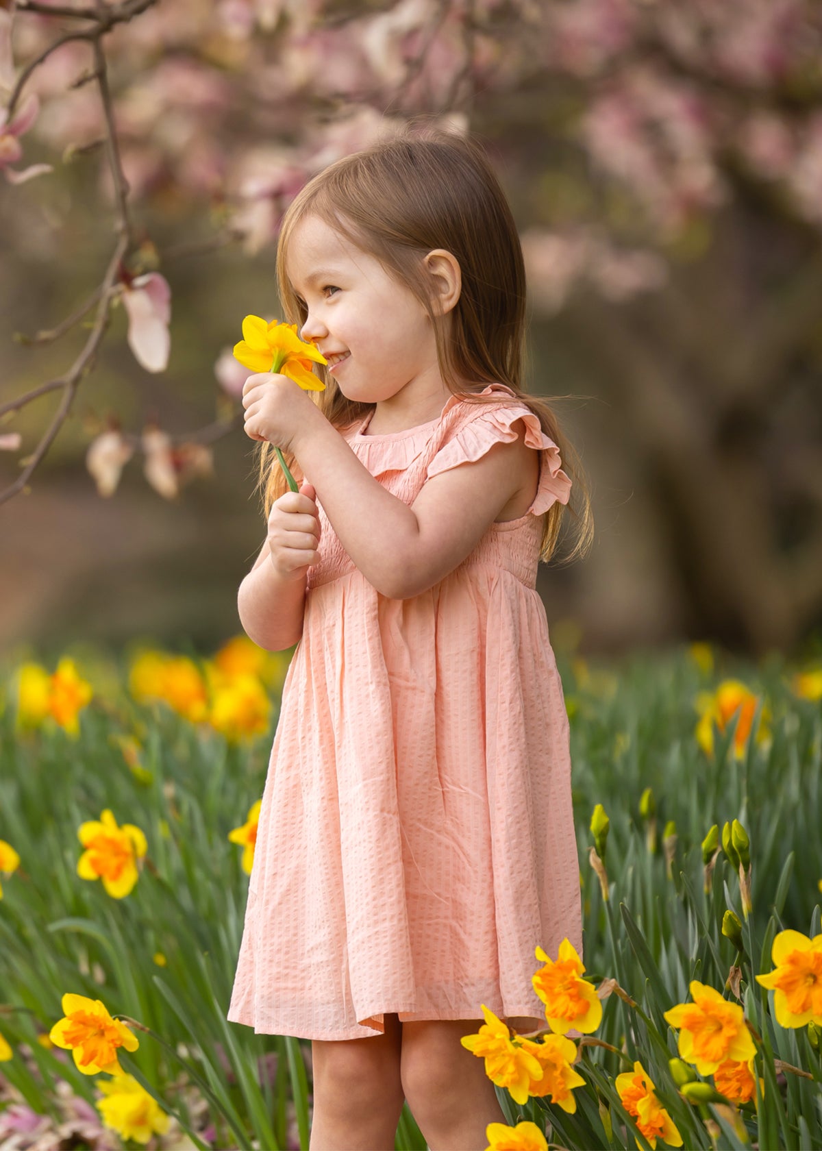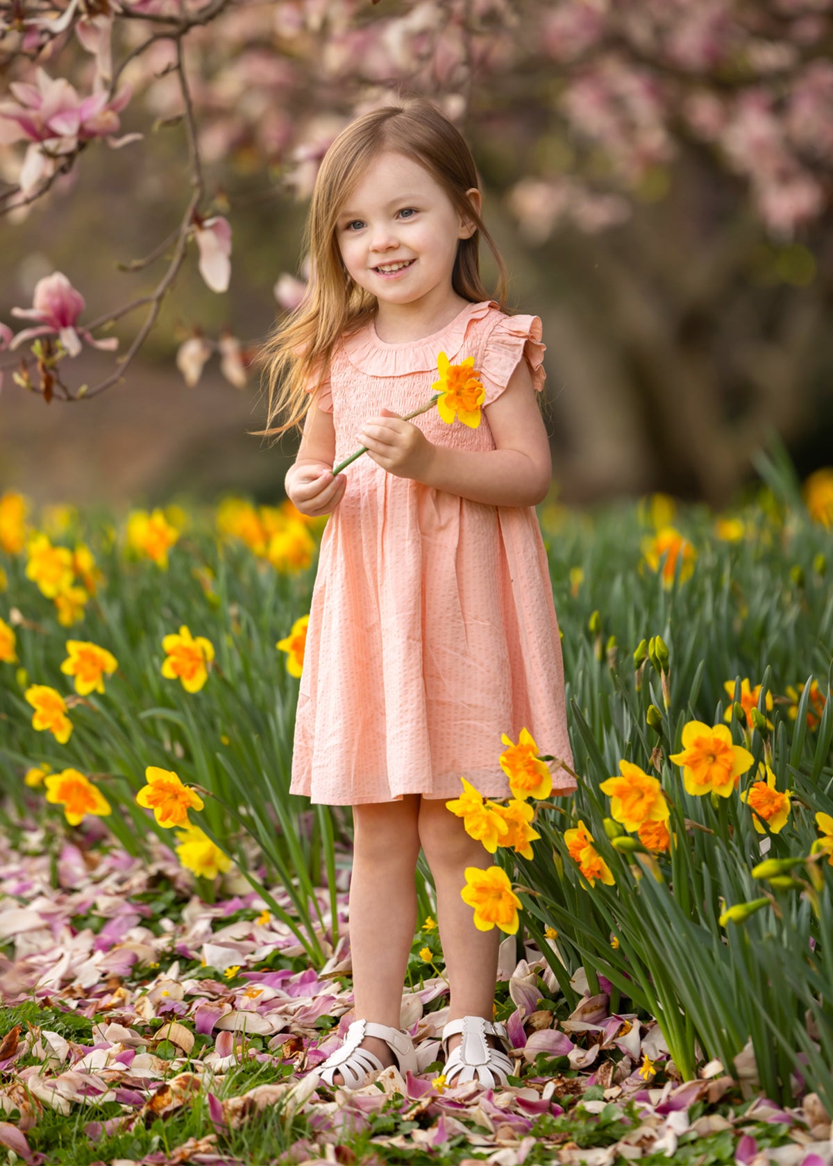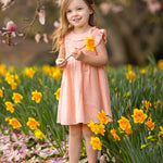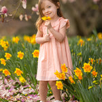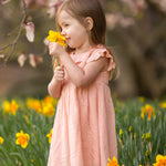 A young girl smiles in a field of yellow daffodils, wearing the Mabel and Honey Jane Ruffled Short Sleeve Dress. She holds a daffodil, with blurred pink blossoms and green foliage in the background.
