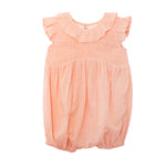 A smiling baby wearing the Mabel and Honey Jane Ruffled Short Sleeve Romper in peach, paired with a matching bow headband, sits barefoot on a light, neutral background.
