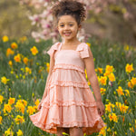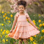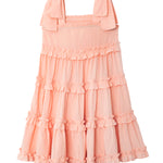This light peach dress features wide shoulder straps with fixed bow detail and a tiered skirt with cascading ruffles for added texture and movement. The fitted bodice transitions into an A-line flowing silhouette, creating a playful and airy design. Subtle textured patterns enhance its visual appeal, making it a versatile choice for warm-weather outings or casual gatherings.