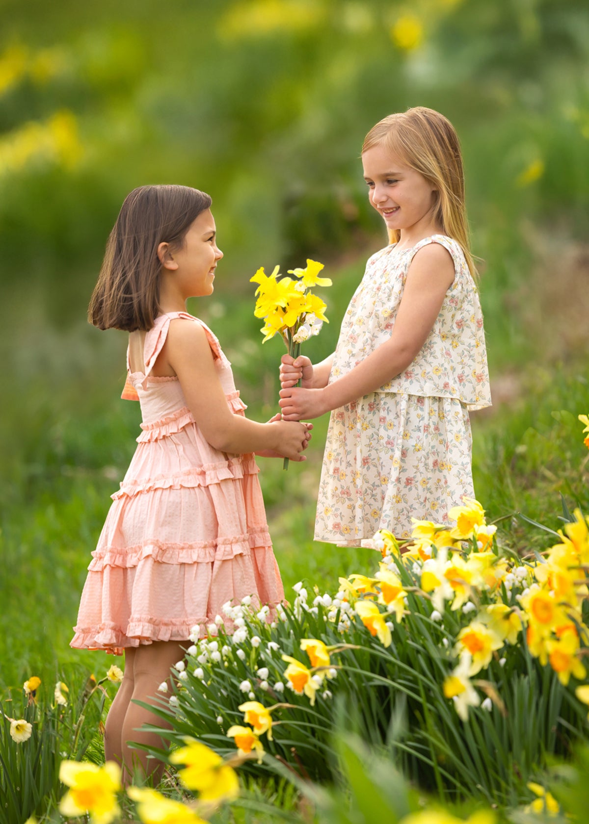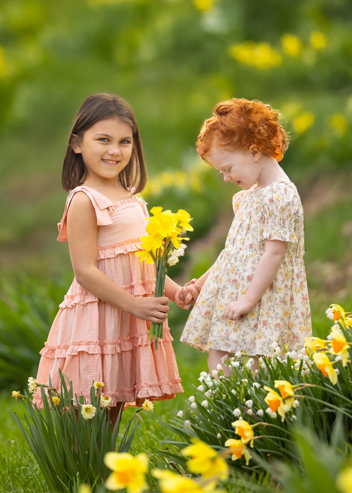 A young girl smiles among yellow daffodils, wearing the Jane Tank Dress by Mabel and Honey. Light peach with an A-line silhouette, her dress stands out against a backdrop of blooming pink magnolia blossoms, capturing a vibrant spring scene.
