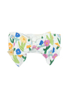 This vibrant hair accessory features a lively floral print. The large, beautifully crafted bow adds a cheerful touch to any outfit. The elastic band ensures a secure and comfortable fit.